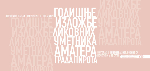 27. nov 2025. 08:03 U Galeriji "Čedomir Krstić" u utorak, 2. decembra, biće otvorena izložba likovnih umentika amatera grada Pirota. Svečano otvaranje je u 19 časova.* Info i foto: Galerija "Čedomir Krstić" -
