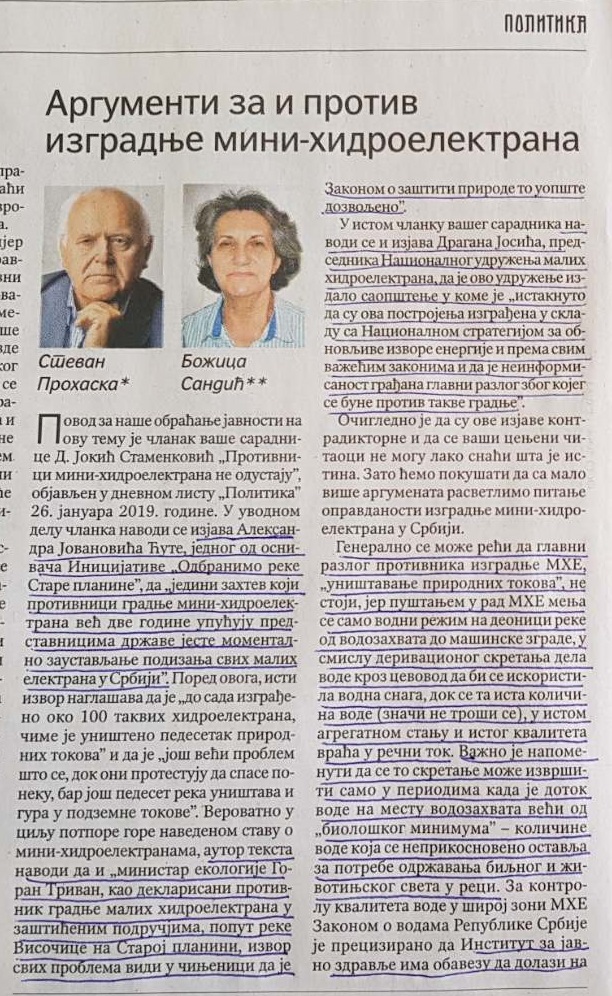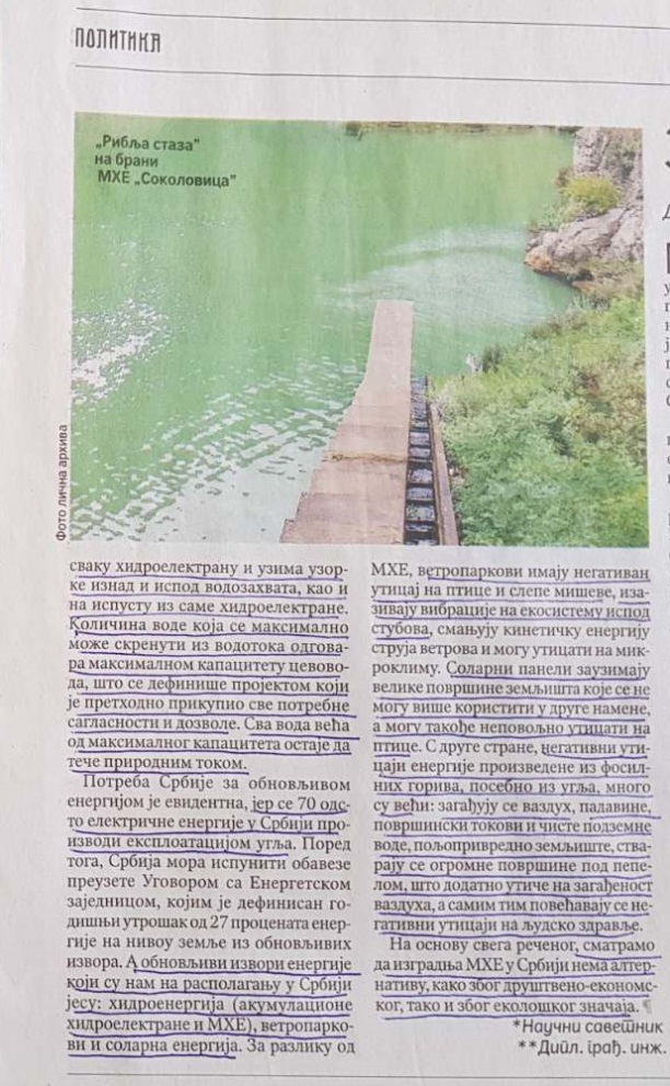 Ne smatrajući ovo što objavljujemo bilo kakvom podrškom bilo kojoj strani, (jer i mi kao i svi ljudi na svetu volimo prirodu, i mi smo protiv uništavanja reka, šuma, i mi smo za očuvanje biljnog i životinjskog sveta, očuvanja života na selu, o čemu smo radili i Projekat), odlučili smo da omogućimo da ljudi koji sukobljavaju mišljenja, iskoriste još jedan prilog koji, smatramo, može da bude od koristi.