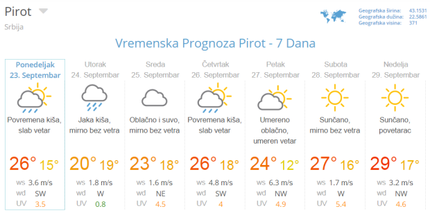 Najniža temperatura od pet do 15, a najviša dnevna od 20 do 26 stepeni.