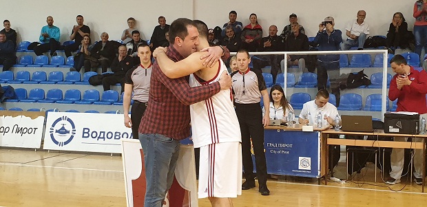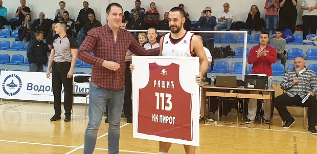 Na poluvremenu utakmice divna svečanost. Dušan Dimitrijević, predsednik, uručio je uramljen dres sa brojkom 113 koliko je naš Raške odigrao utakmica za KK Pirot.