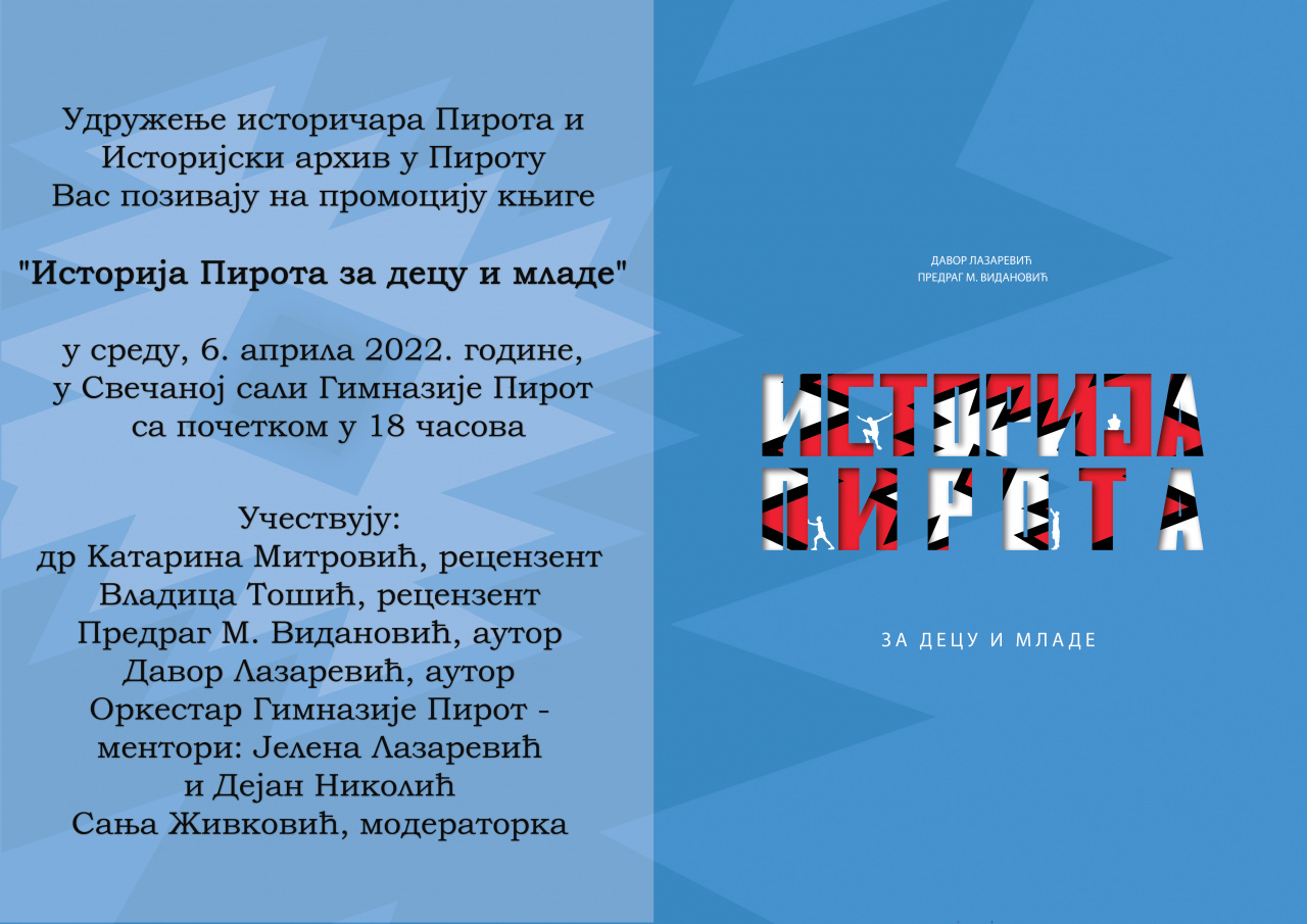 U organizaciji Udruženje istoričara Pirota i Istorijskog arhiva u Pirotu biće održana promocija knjige "Istorija Pirota za decu i mlade", autora Davora Lazarevića i Predraga M.Vidanovića.