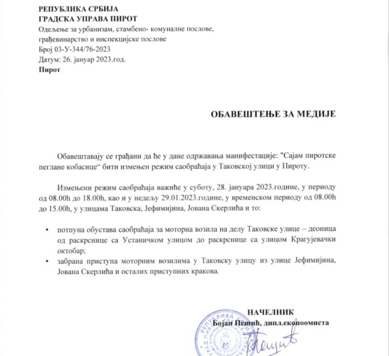 Iz Gradske uprave Pirot obaveštavaju da će za vreme trajanja Sajma peglane kobasice doći do izmene režima saobraćaja.