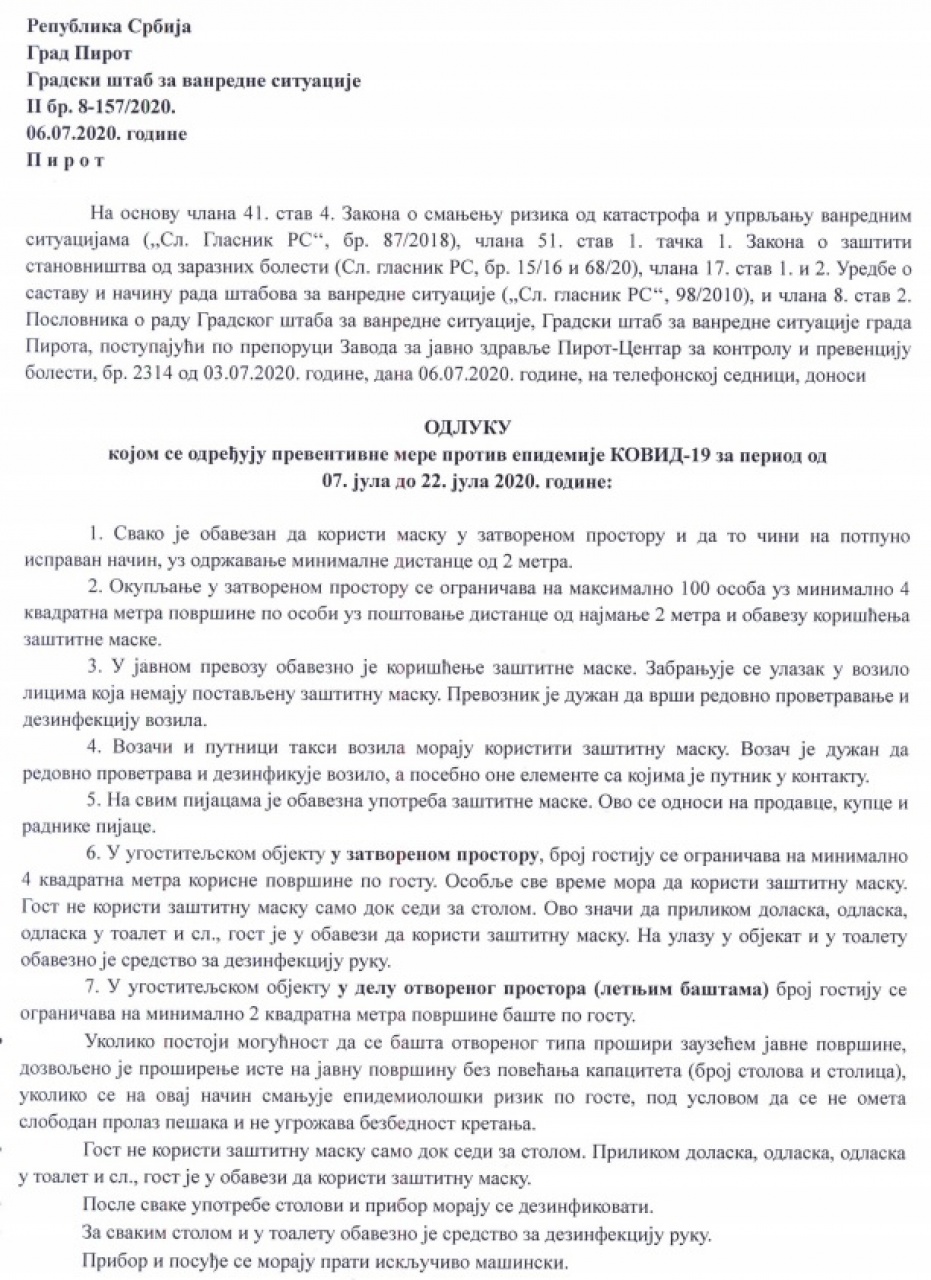 Na telefonskoj sednici, održanoj danas6. jula, Štab za vanredne situacije grada Pirota, postupajući po preporuci Zavoda za javno zdravlje Pirot, doneo je Odluku o uvođenju preventivnih mera protiv epidemije COVID19, koje su oročene na period od 7. do 22. jula.