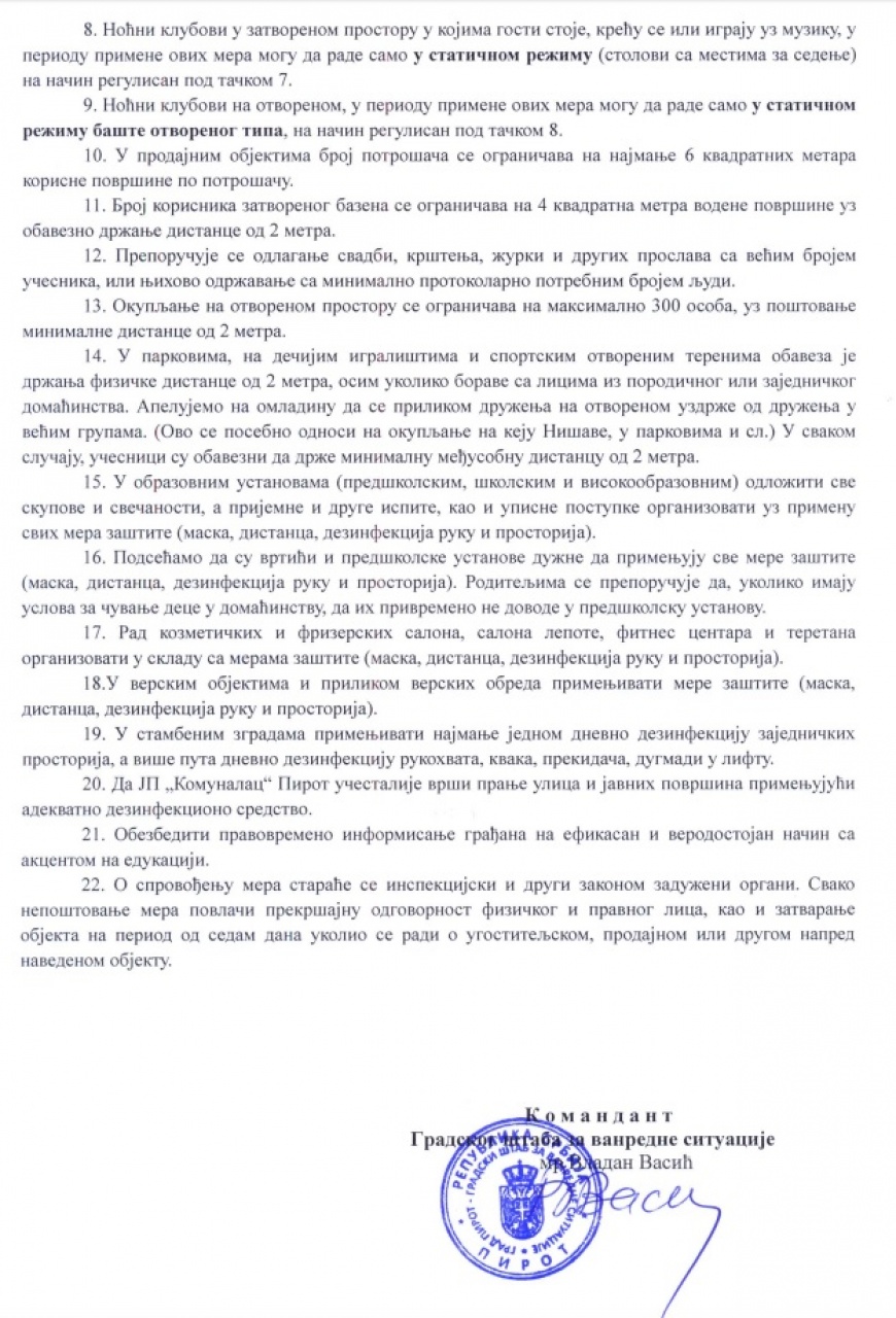 Štab za vanredne situacije grada Pirota propisao 22 nove mere. Maske u zatvorenom prostoru obavezne, ograničavaju se veća okupljanja.....