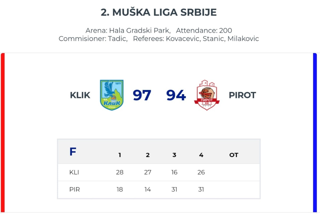 18. apr 2026. 06:12 Prva liga Istok, Grupa B, 13. koloŽRK Pirot - ŽRK Vranje 35:22 (18:10)ŽRK Pirot: Kostić, Rančić 1, Potić 5, Čampa, Filipović 1, Ćirić, Panić 3, Petković 3, P. Dimitrijević, Ristić Nikolić 1, ...