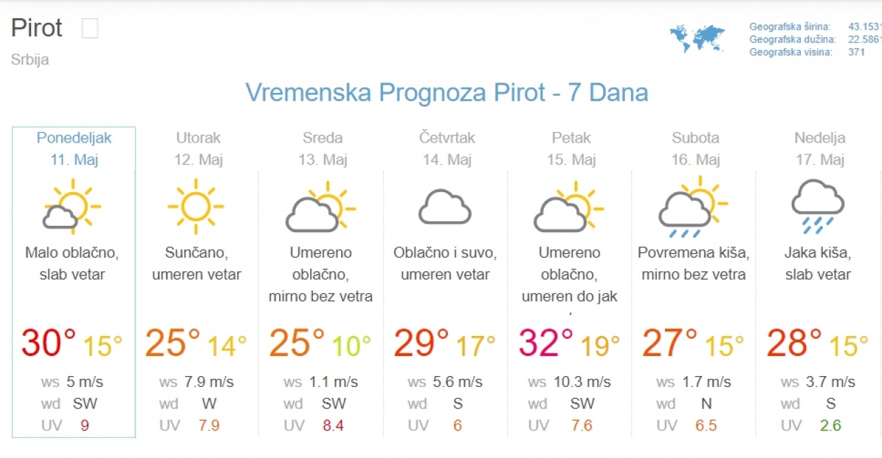 Temperatura 26 stepeni. Pritisak 957mb u padu. Vlaga 32%. Vetar zapadni 1-2 m/sek. Najtoplije je bilo danas izmedju 14 i 15h. Indeks UV zračenja 8. U Dimitrovgradu 29 stepeni, praksa kaže, da je kod nas uvek stepen, dva više. Dimitrovgrad je na 370 metara nadmorske visine, Pirot, na 340. Jučerašnji i današnji dan najtopliji su u ovoj godini. Na moje pitanje, o promeni vremena, Boris je odgovorio jednom reči: proleće!