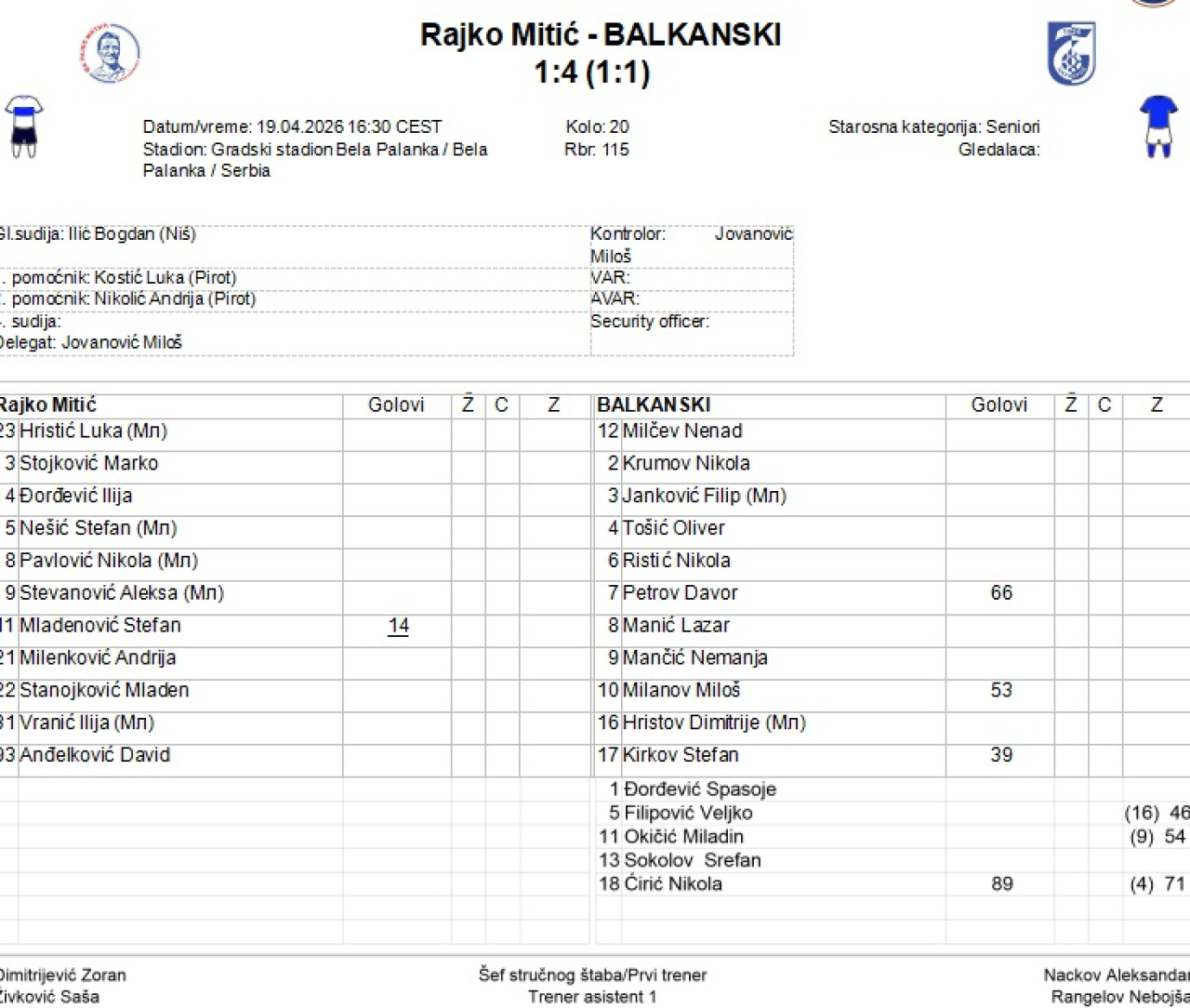 Bela Palanka: Rajko Mitić – Balkanski 1:4 (1:1)
