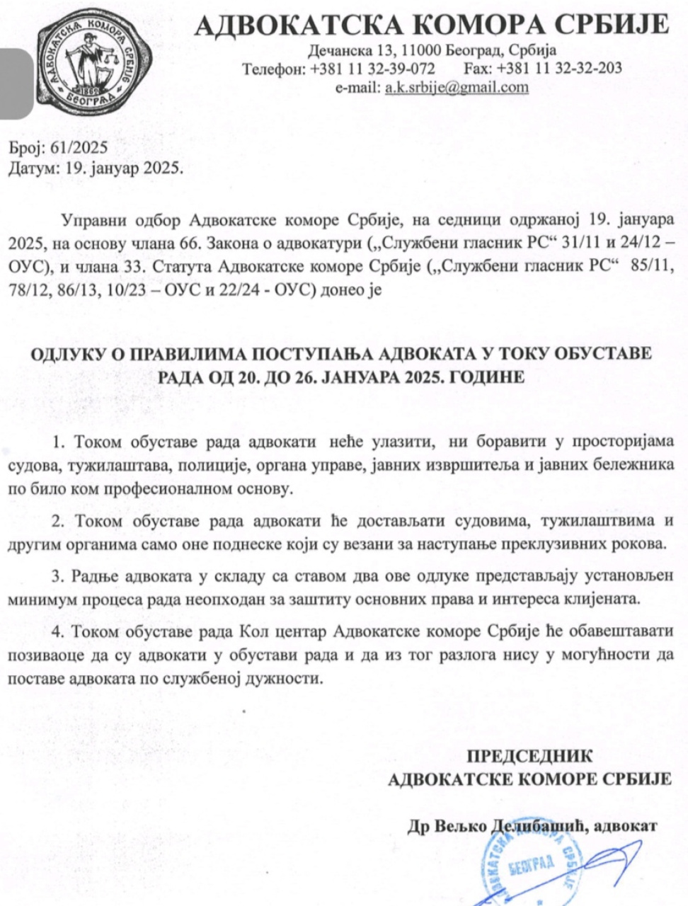 Advokatska komora Srbije, posle jučerašnje odluke da obustavi rad advokata na sedam dana (od 20. do 26. januara), donela je i pravilnik postupanja tokom ove obustave.