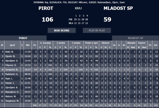 Pirot: Pirot - Mladost Sm. Palanka 106:59 (29:12, 21:15, 28:17, 28:15)
