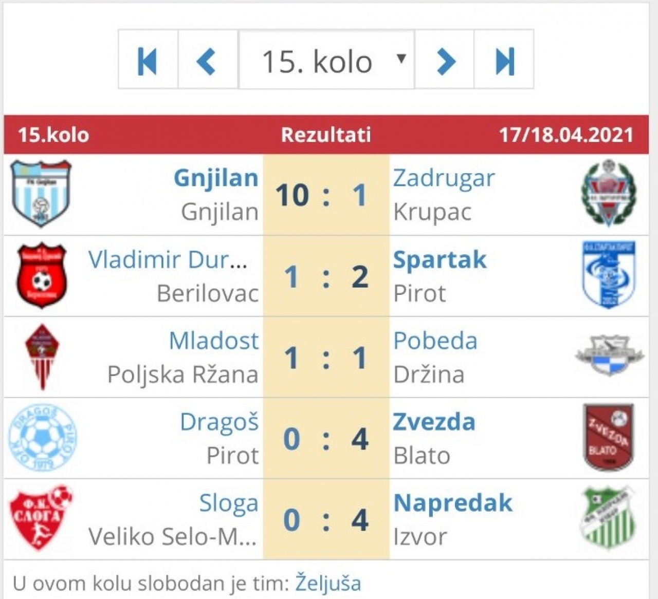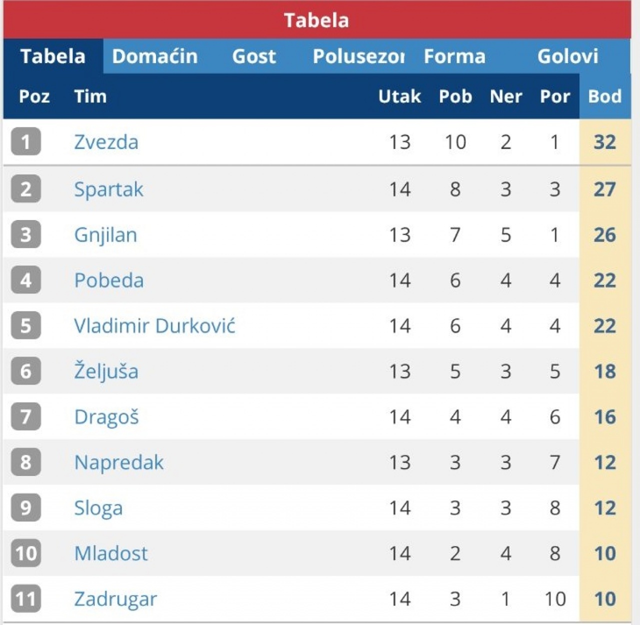 26. okt 2025. 18:11 Srpska liga Istok, 11. koloStadion "Dragan Nikolić"Pirot: Radnički - Bor 1919 1:3 (0:2)Radnički: Mirković, Nedeljković, Petrov, Mladenović, Vojinović, Dušanić, Đorđević, N. Petrović, M. ... -