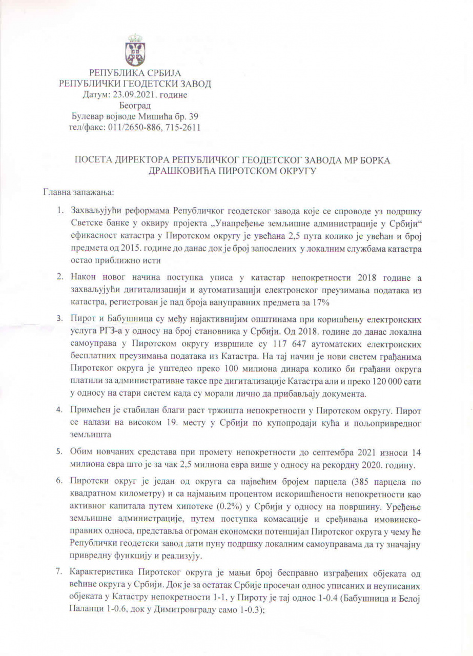 Pirot je danas posetio generalni direktor Republičkog geodetskog zavoda mr Borko Drašković. Tim povodom održan je sastanak sa gradonačelnikom Pirota, načelnicom Pirotskog upravnog okruga i predsednicima opština Bela Palanka, Babušnica i Dimitrovgrad.