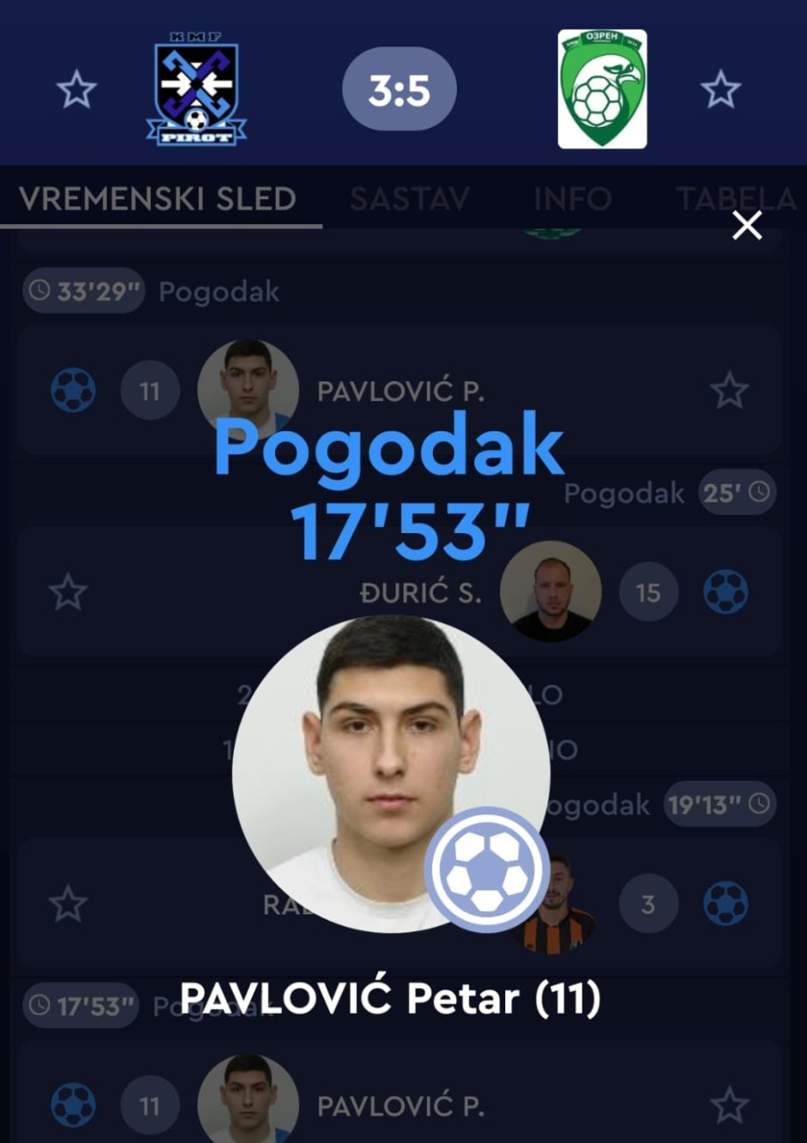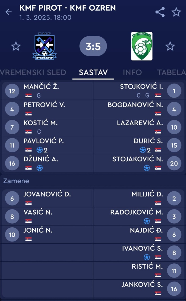 21. apr 2026. 10:12 Treća futsal liga, 19. koloHala KejPirot: KMF Pirot - KMF Rosulja (Vlasotince) 5:2 (4:0)Zanimljiva utakmica po nekim detaljima koji su specifični.Gosti iz Vlasotinca igraju taktički onu igru "ili sve ...