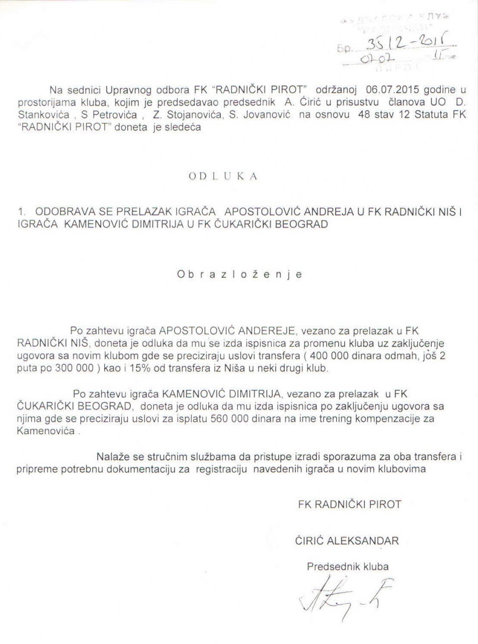 Zbog toga smo blagovremeno, pre nekoliko dana, poslali zahtev da nam FK Radnički dostavi zapisnik sa sednice Upravnog odbora iz 2015. godine na kojoj se razgovaralo, odlučivalo, o odlasku, sticajem okolnosti, dvojice igrača Andreje Totija Apostolovića i Dimitrija Kamenovića.