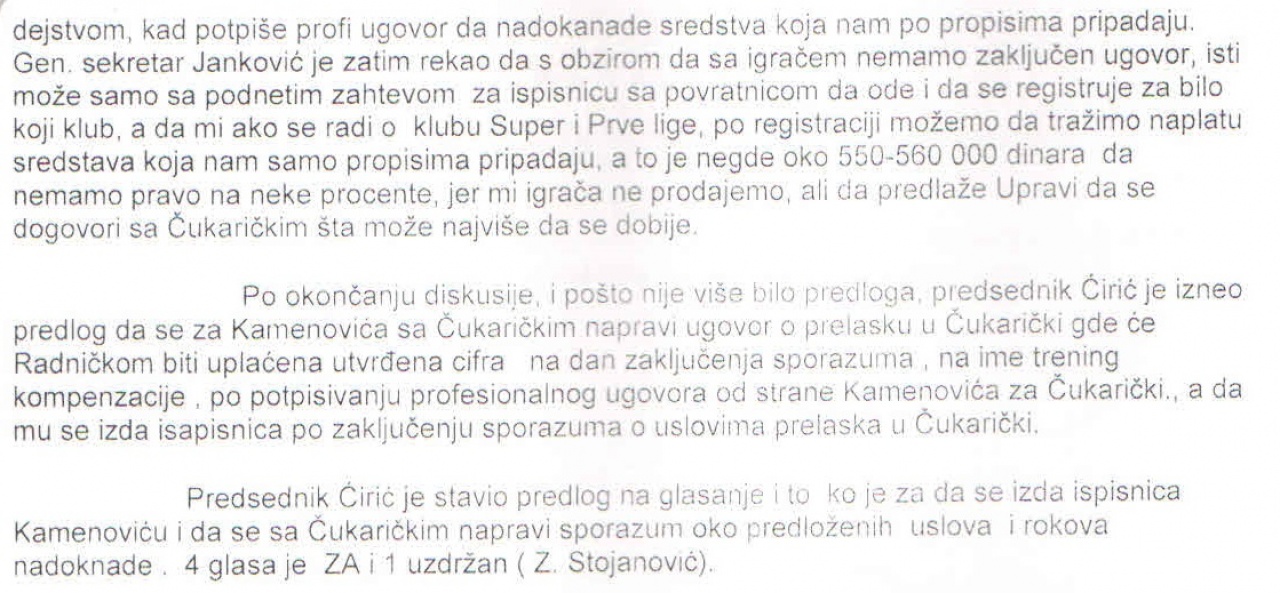UO je uzeo u obzir činjenicu da se poslednjih meseci u medijima ( kojim- samo u našem) previše pisalo i govorilo o tome I da je u interesu Kluba da Vam se tražena dokumentacija dostavi. U tom cilju, dostavljena je I Odluka kojom se odobrava dostavljanje zapisnika sa sednice UO koja se odnosi na transfer D.Kamenovića u Čukarički 2015. god.