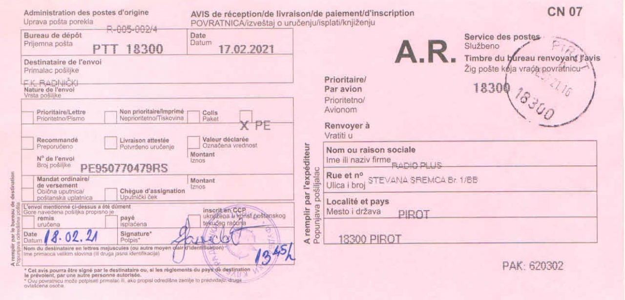 Ovo je dokaz da smo dopis uredno poslali brzom poštom i da je u Radničkom primljen.