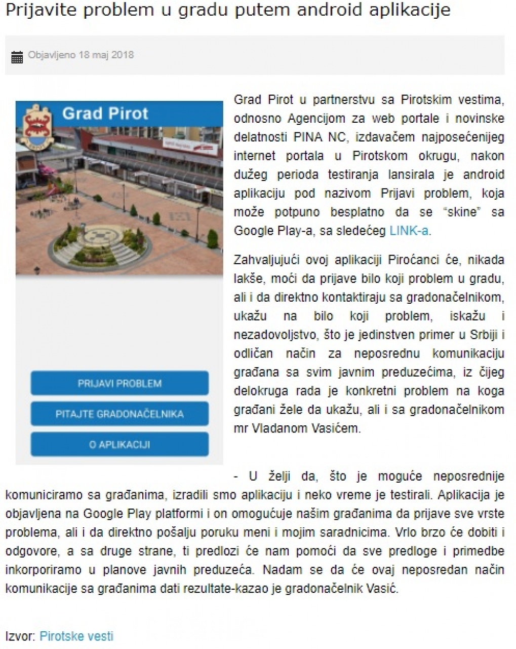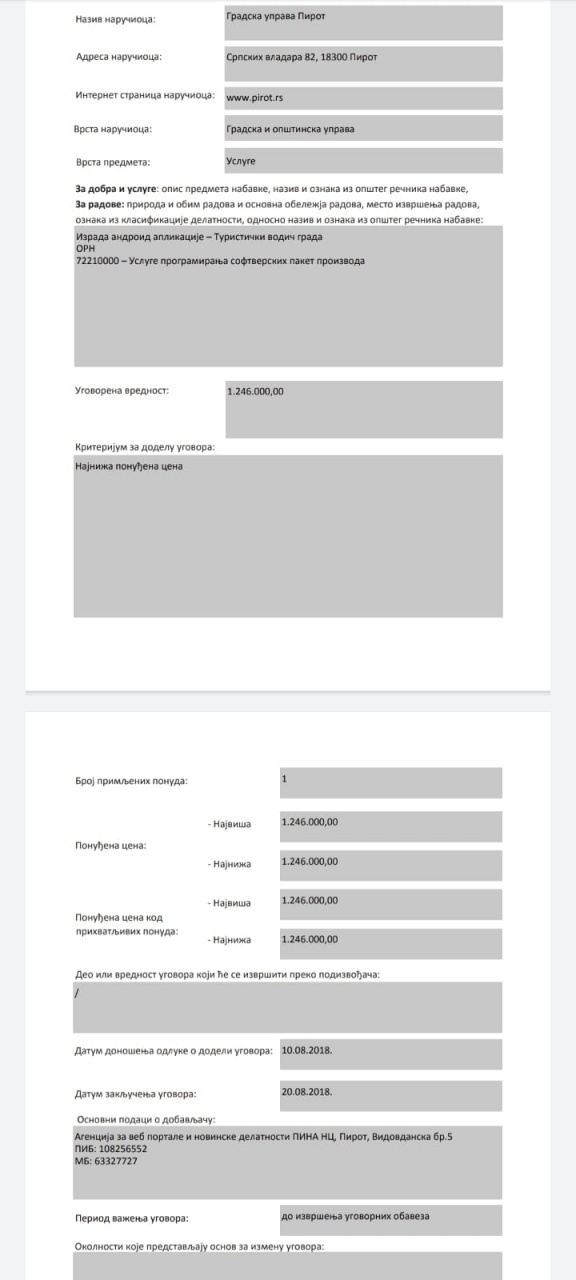 To me podsetilo na Ugovor koji je tadašnja Direkcija, zašto oni, potpisala sa Agencijom PINA NC, vlasnik je Aleksandar Ćirić, vlasnik Pirotskih vesti i kum Aleksandra Ćirića, šefa kabinta i gradskog većnika zaduženog za investicije. PINA nc je za izradu aplikacije dobila deset hiljada evra "narodnih para" za ovaj posao.