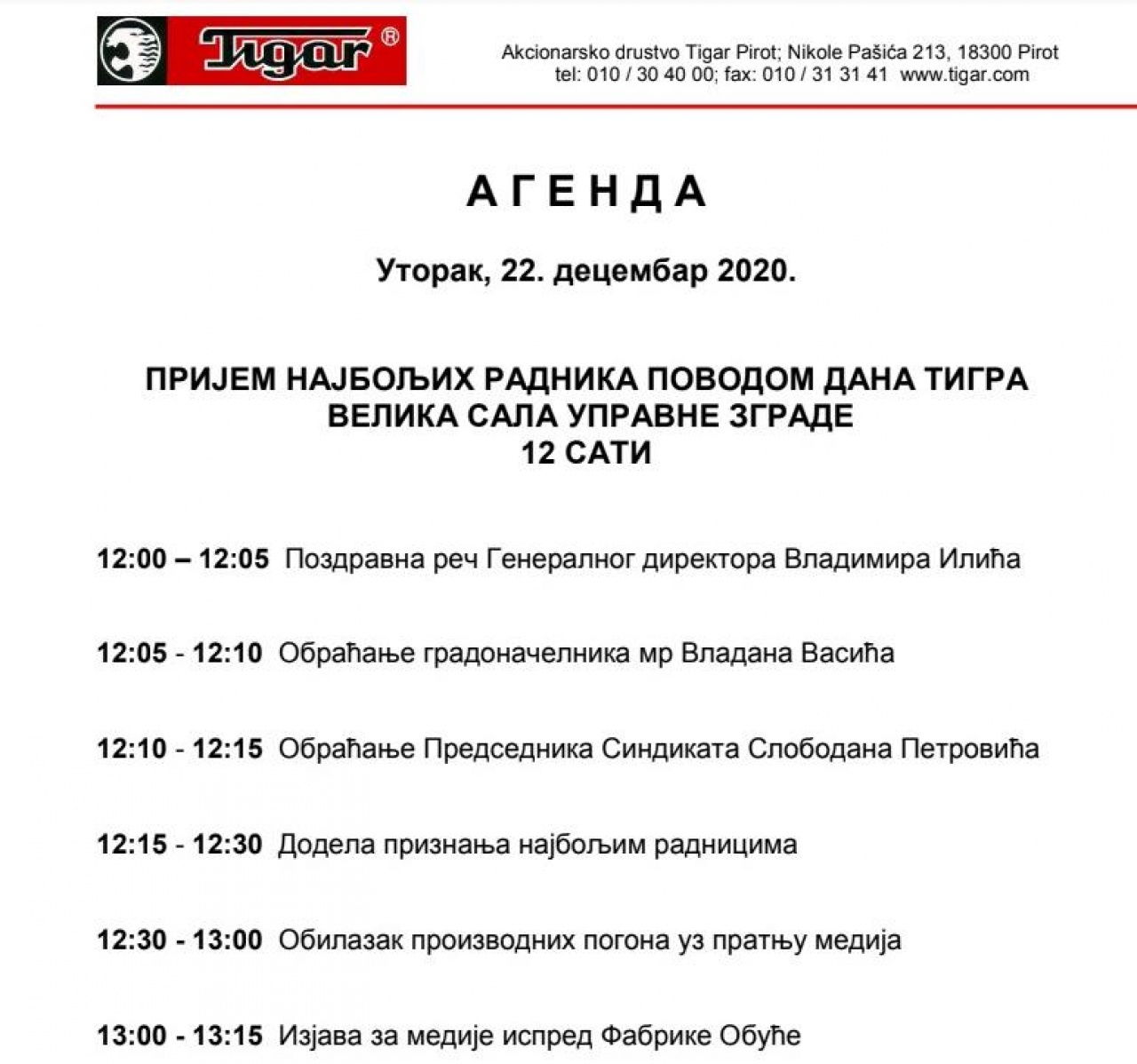 Protokolom je predvidjeno obraćanje Vladimira Ilića, generalnog direktora, Vladan Vasića, gradonačelnika Pirota i Slobodana Petrovića, predsednika Sindikata.