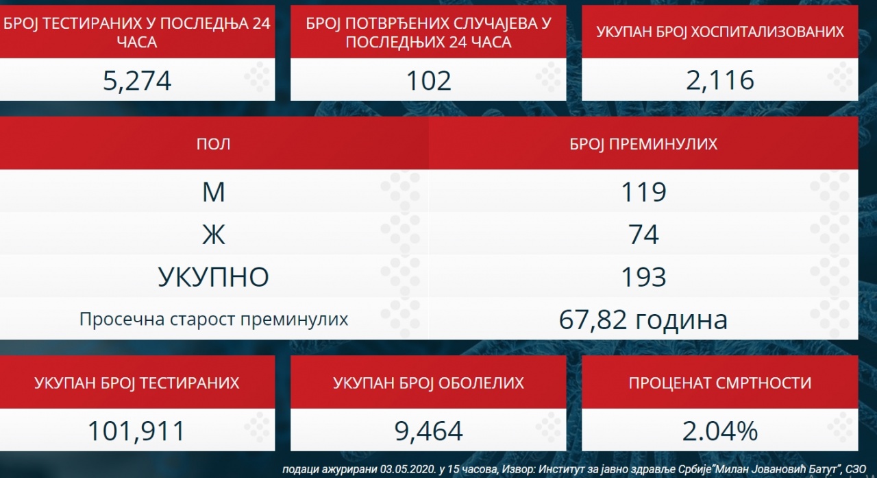 U Republici Srbiji je do 15 časova 03. maja 2020. godine registrovano ukupno 9.464 potvrđenih slučajeva COVID 19.