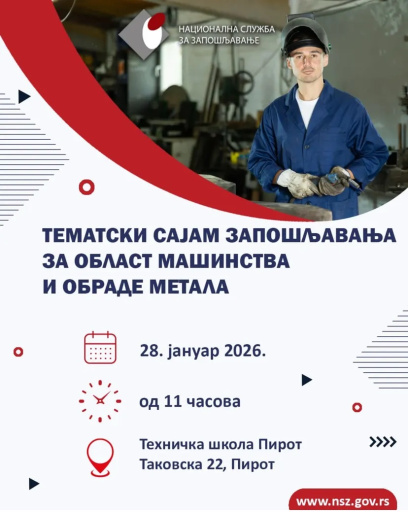 22. jan 2026. 12:48 Tematski sajam zapošljavanja za oblast mašinstva i obrade metala – 28. januar 2026.Nacionalna služba za zapošljavanje (NSZ) - Filijala Pirot poziva poslodavce i nezaposlena ... -