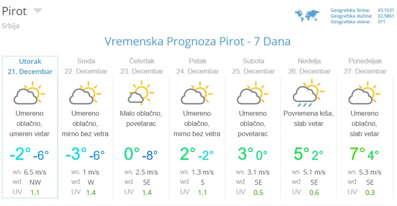 U Pirotu u 10 časova 0 stepeni, pritisak 977mb, vlažnost vazduha 79%, vetar severozapadni 3m/s. Najniža temperatura zabeležena jutros u 8 časova -1,1 stepen.