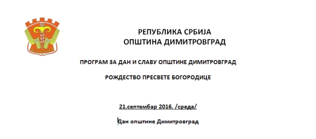 Danas će u Dimitrovgradu nizom prigodnih aktivnosti, obeleženi Dan i Slava Opštine. Posle prijema u kabinetu predsednika Opštine Vladice Dimitrova biće održana Svečana sednica na kojoj će biti uručena priznanja i govoriti o postignutim rezultatima u predhodnom periodu i najaviti program za dalje aktivnosti. Danas će biti uručena i donacija Ambasade Japana. Svečanosti će trajati tri dana .