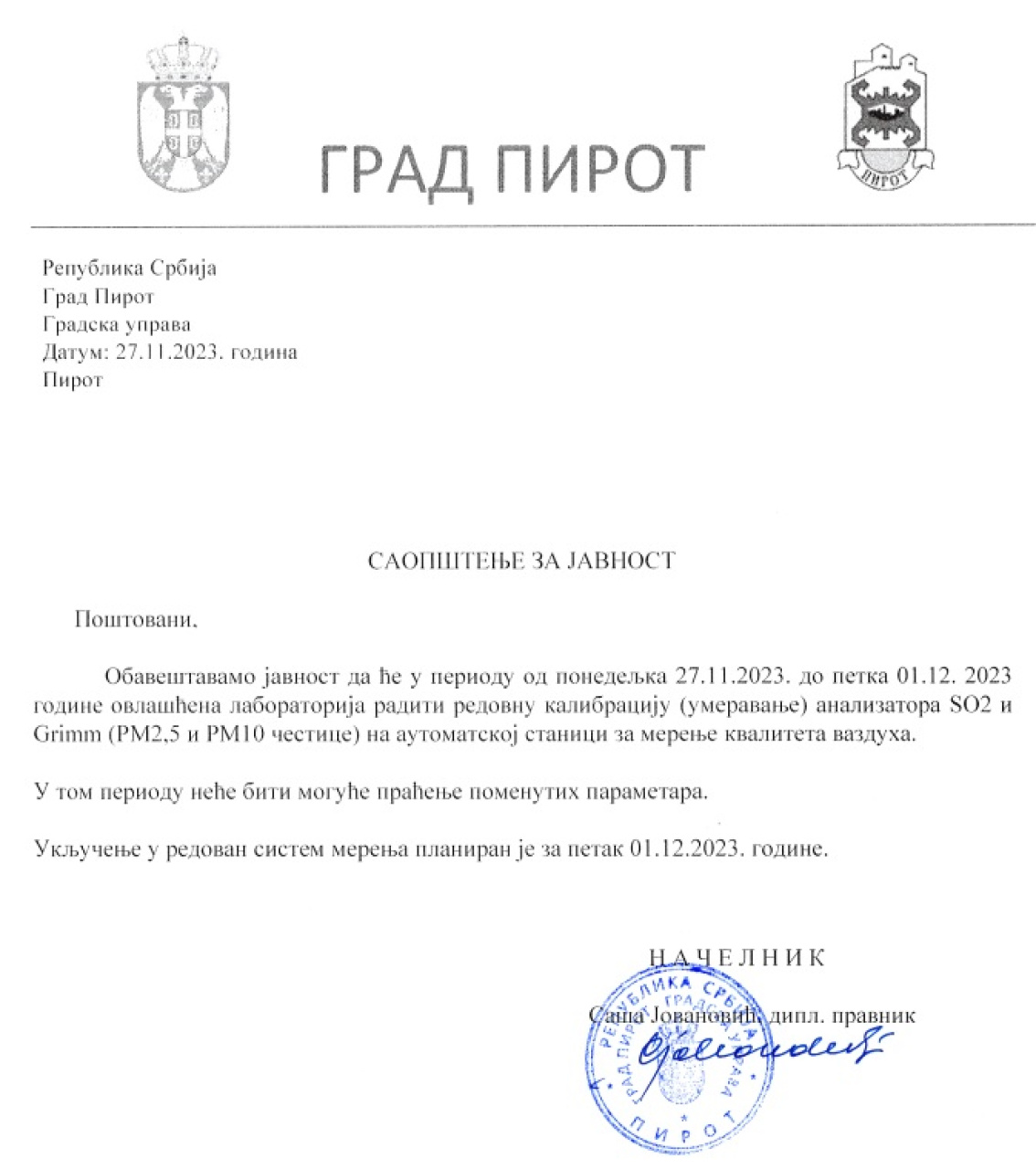 Iz Gradske uprave Pirot stigao je dopis u kojem se javnost obaveštava da će do petka, 1. decmbra, ovlašćena laboratorija raditi redovno umeravanje analizatora SO2 i Grimm na automatskoj stanici za merenje kvaliteta vazduha.