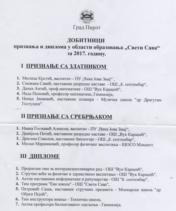 Danas je u Svečanoj sali Gradske uprave, po tradiciji, upriličena svečanost na kojoj su uručena priznanja uspešnim prosvetnim radnicima. Milica Golubović, pomoćnica gradonačelnika za vanprivredu pozdravila je prisutne, čestitala predstojeću Školsku slavu i u ime predsednice Komisije pročitala imena nagradjenih.