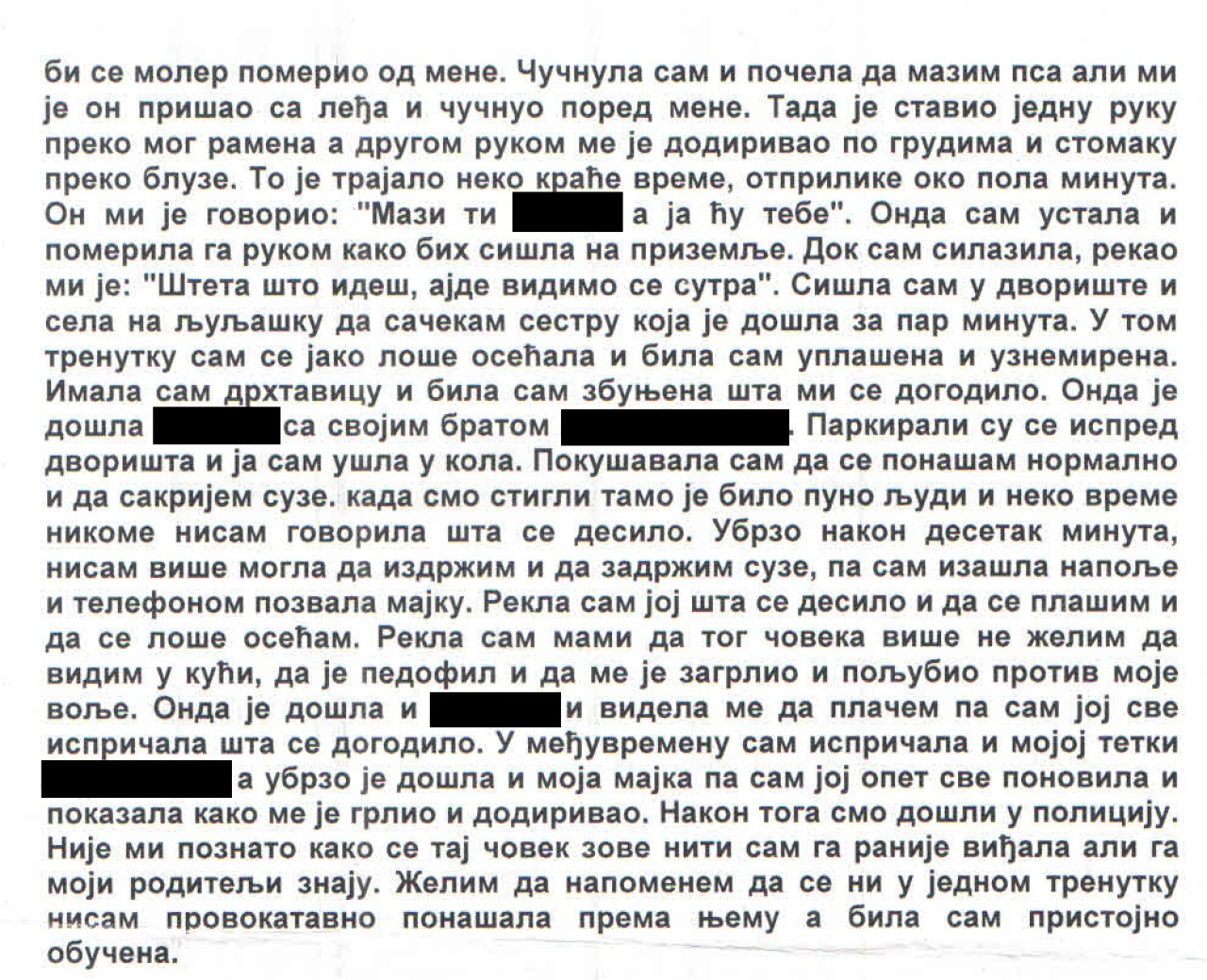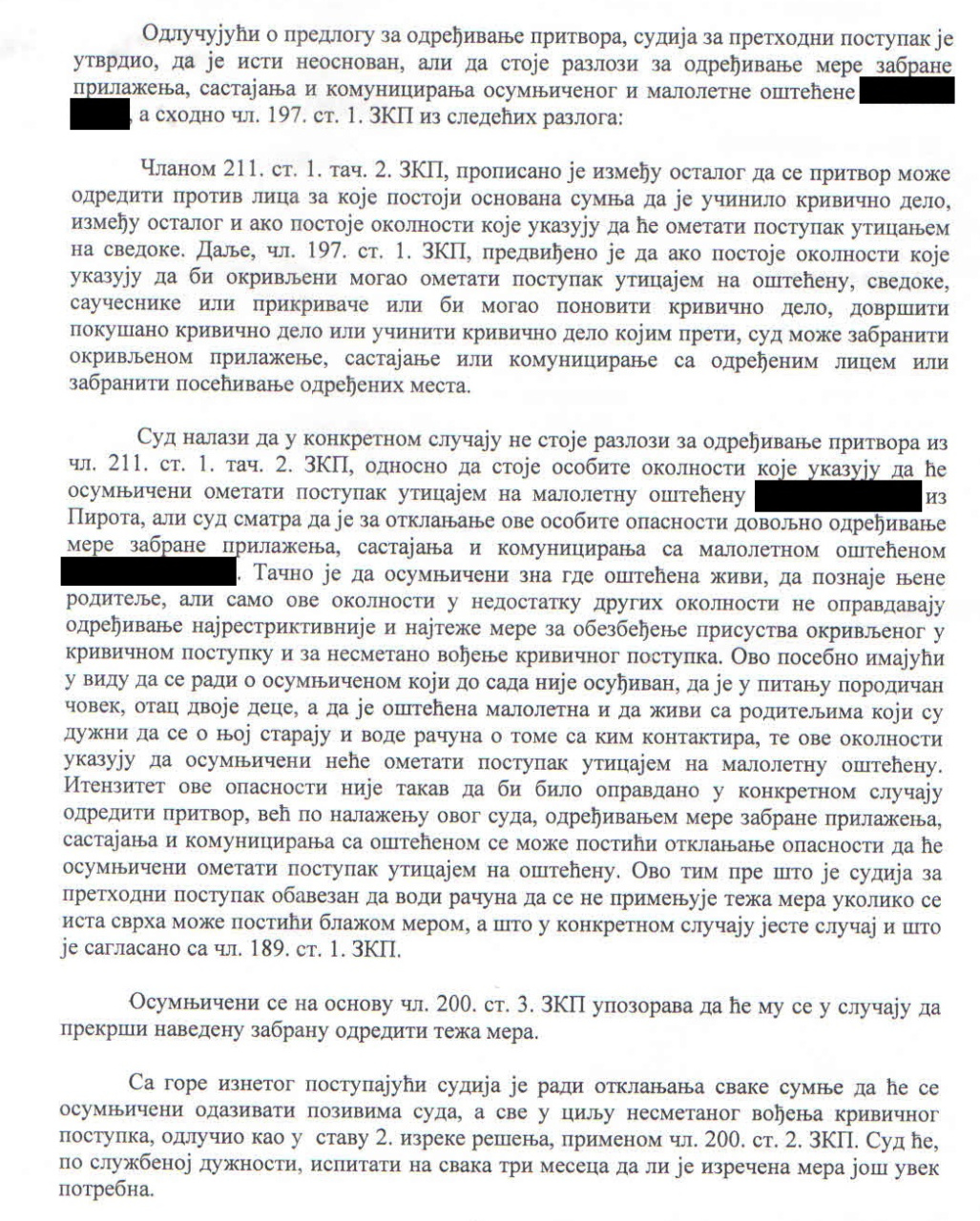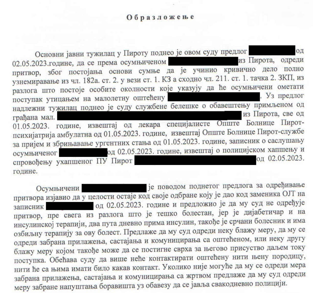Čovek koga smo pustili u kuću uradio je zlo delo za koje je tužilac tražio pritvor, a Sud naložio zabranu prilaska. Tog čoveka nismo znali i zašto bi on prilazio našem detetu. Znamo i to da je njegova uža rodbina bliska Policiji i Sudu.