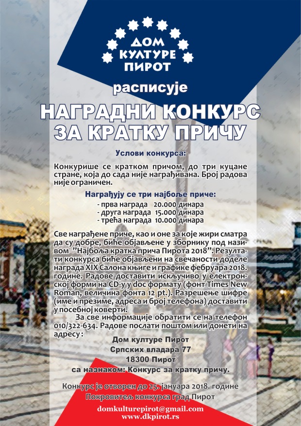 Dom kulture Pirot, tradicionalno svake godine raspisuje nagradni konkurs za kratku priču.