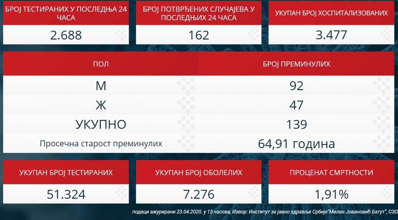 Republici Srbiji je do 15 časova 23. aprila 2020. godine registrovano ukupno 7.276 potvrđenih slučajeva COVID 19.