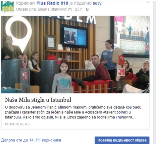 Očekujući s nestrpljenjem prve vesti iz Bolnice Acibadem Atakent gde je danas pre podne pregledana naša mala Mila Panić, nastojimo i nastojaćemo da na dokumentovan način, bez senzacija i pojedinačnih nastupa, podstičemo naše ljude na humanost. Mada, da budemo iskreni, to i nije bilo tako potrebno, jer su naši ljudi od prvog dana kada je vest objavljena, tražili načine kako da pomognu. Činio je to Rotarakt postavljanjem 25 kutija u Marmilu, restoranima, kafićima, na humanitarnoj utakmici Senjak – Balkanski, u Hali na Zimskom turniru u malom fudbalu. U Pirotu u kafićima Sneč i Fuzz i Klub Elita u Babušnici organizovane su humanitarne večeri. Dom kulture od sutra, naredne tri večeri organizuje humanitarne programe. Kutije će biti postavljene na ulazu u salu. Naša sugradjanka nam je poslala informaciju da i u Nišu postoji akcija prikupljanja sredstava.