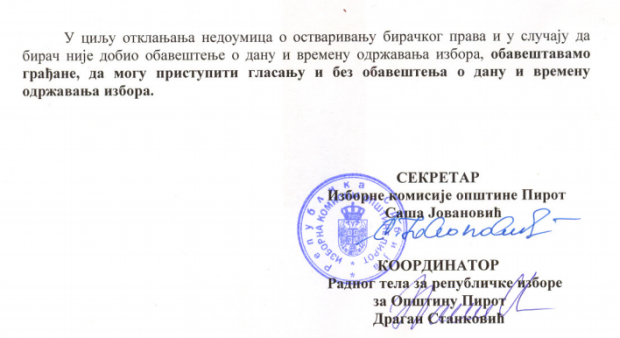 Danas smo od Dragana Stankovića, koordinatora Radnog tela za republičke izbore za Opštinu Pirot saznali sve detalje koji karakterišu izbore , kada je u pitanju broj upisanih birača, biračkih mesta, rad sa članovima biračkih odbora... Uz sve to, stigla je još jedna poruka za gradjane.