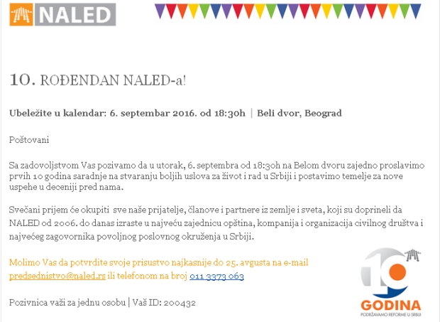 05. sep 2016. 13:30 Proslava 10. godišnjice NALED-a, sreda, 7. septembar od 18:30, Beli dvor, Beograd -