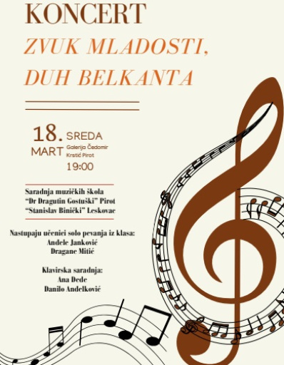 16. mar 2026. 09:11 U utorak i sredu 17.i 18.marta u Muzičkoj školi "Dr Dragutin Gostuški" biće održan besplatan majstorki kurs solo pevanja za učenike pod nazivom "Osnove vokalne tehnike i interpretacije".... -