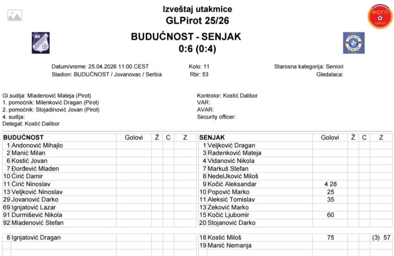 Veliki Jovanovac: Budućnost – Senjak 0:6 (0:4)