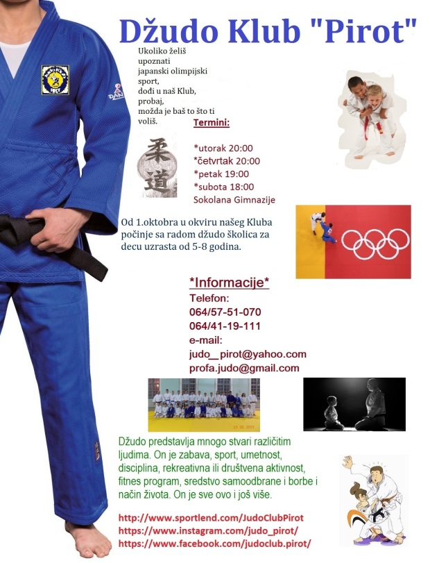 Tokom septembra i oktobra Dzudo klub Pirot upisivaće nove ćlanove. Novina na treninzima je to da će od 1.oktobra početi sa radom i džudo školica za decu od 5 do 8 godina.