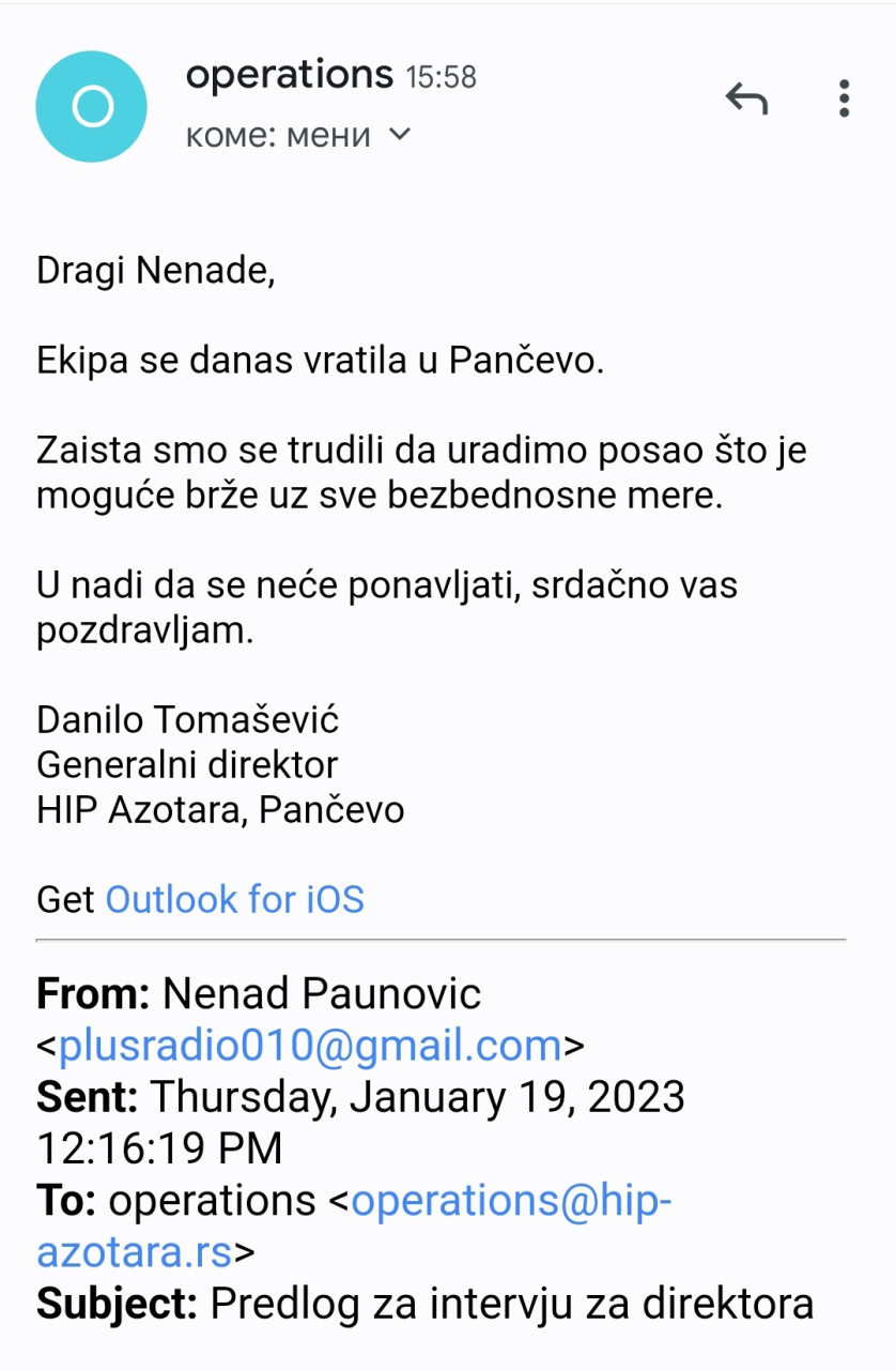 Dok sam se pripremao za poslednji raport iz Staničenja, stigao je mejl generalnog direktora Azotare Pančevo.