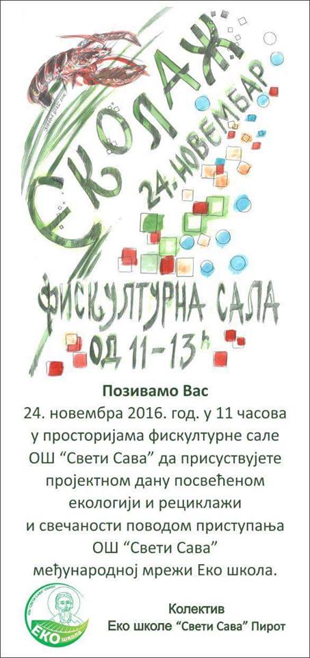 U OŠ “Sveti Sava” u četvrtak 24.novembra u čast dobijanja eko zelene zastave biće održan projektni dan posvećen ekologiji i reciklaži i svečanosti povodom pristupanja Škole međunarodnoj mreži Eko škola.