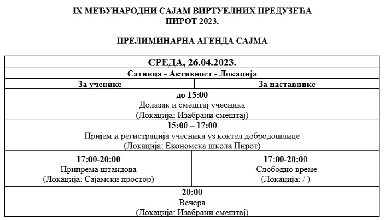 U Hali Kej 27. i 28.aprila biće održan IX Međunarodni sajam virtuelnih preduzeća koji organizuju Ekonomska škola Pirot i Zajednica ekonomskih, pravno - birotehničkih, trgovinskih i ugostiteljsko - turističkih škola Republike Srbije. Sajam će okupiti učenike iz 25 škola širom Srbije i jedne iz Bugarske.