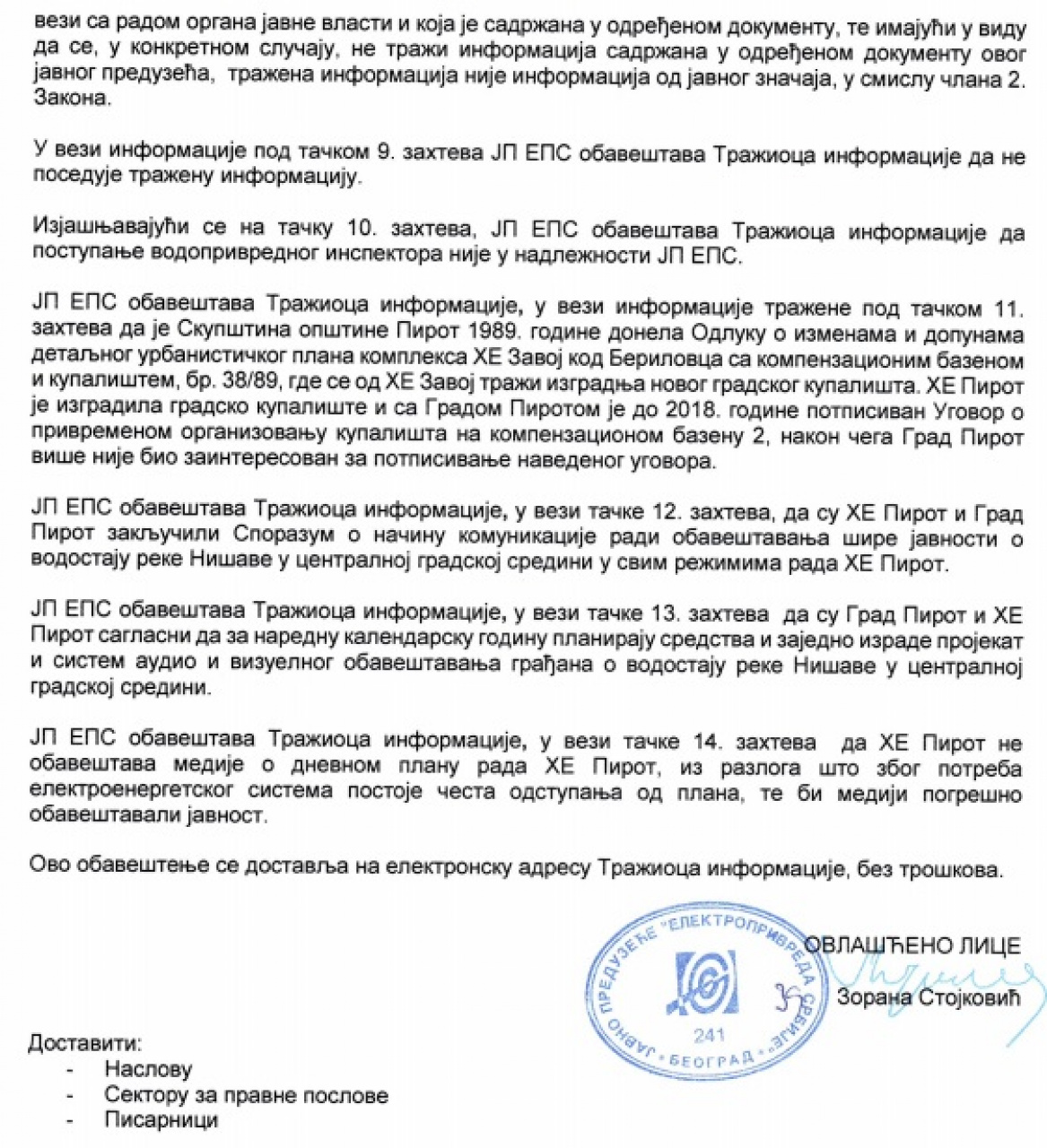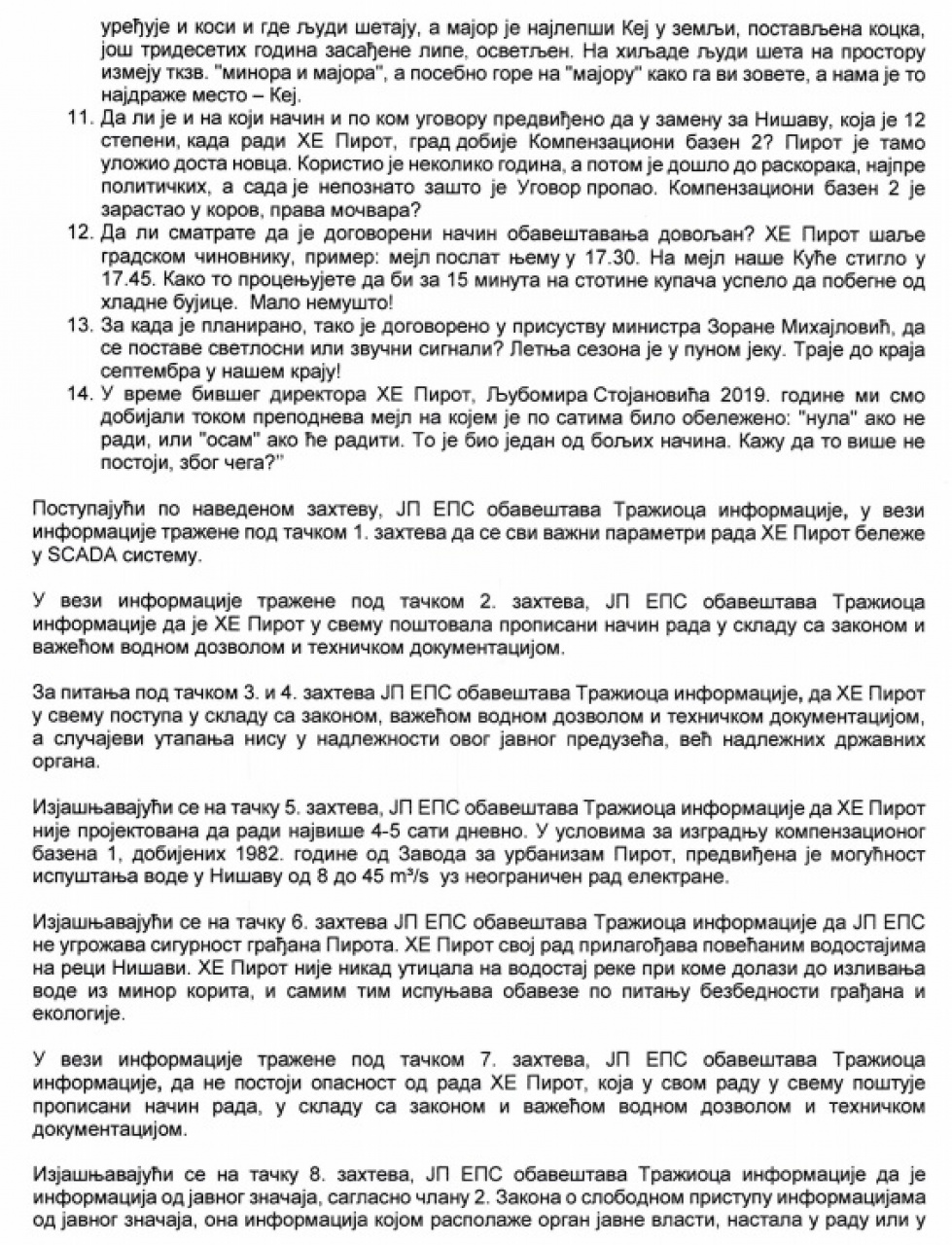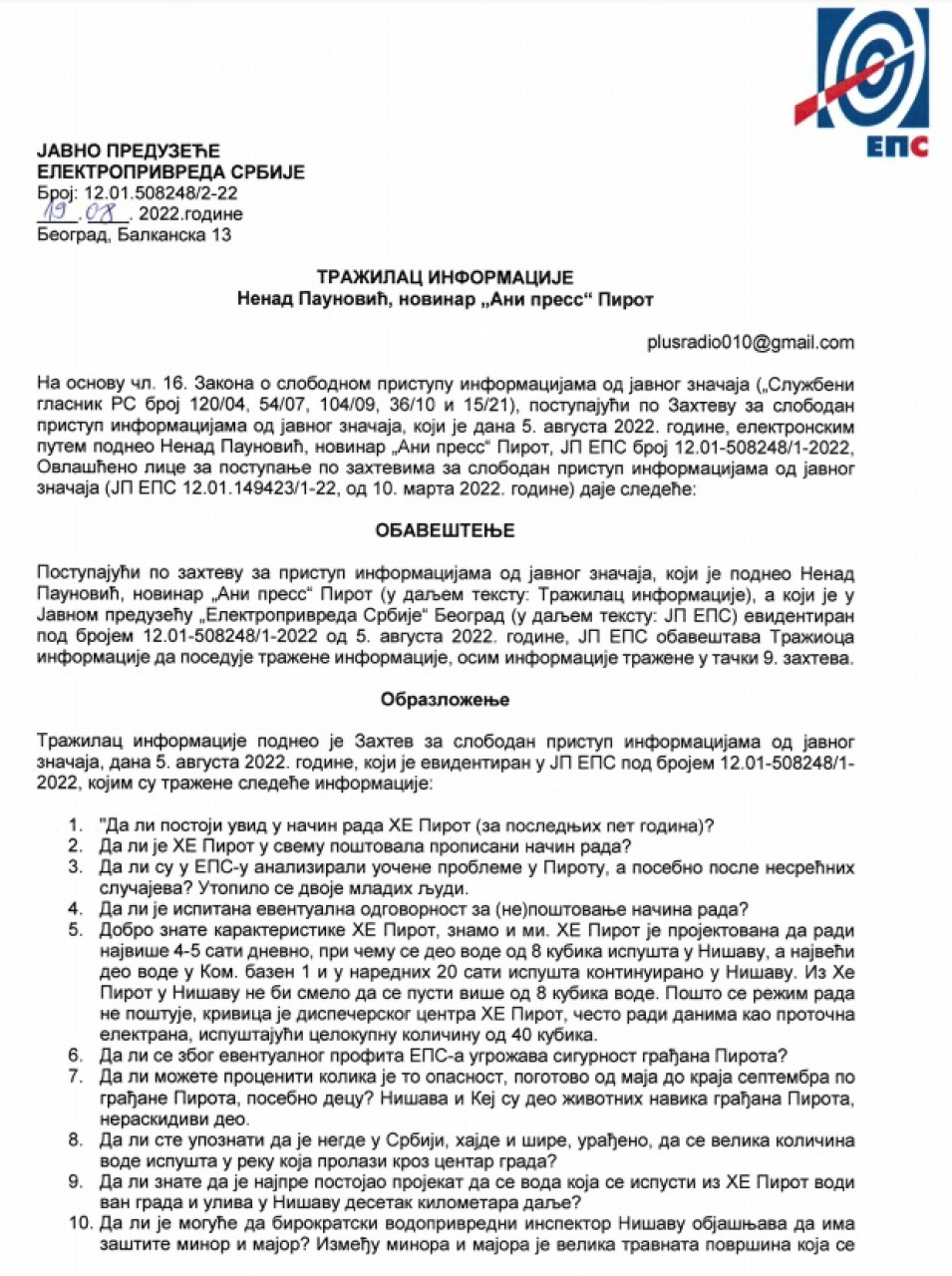 Tek sto smo danas postavili objavu kao reakciju na poslednje aktivnosti HE Pirot i mejl našeg sugrađanina, prijatno nas je iznenadilo ODGOVOR Elektroprivrede Srbije na pitanja koje smo poslali.