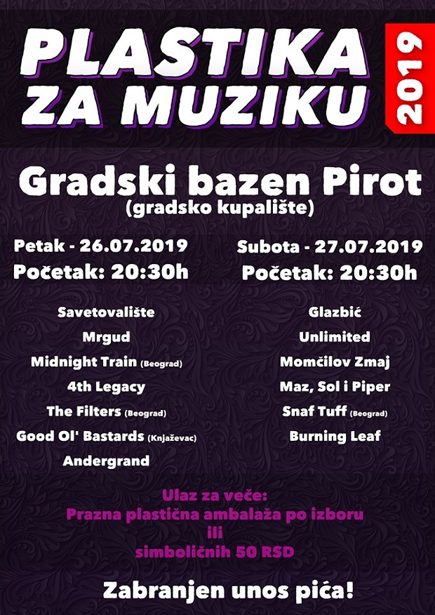 Na Gradskom kupalištu u Pirotu 26. i 27. jula održaće se jubilarni peti Festival “Plastika za muziku”. Tom prilikom nastupiće lokalni rok bendovi i gosti iz Knjaževca i Beograda.