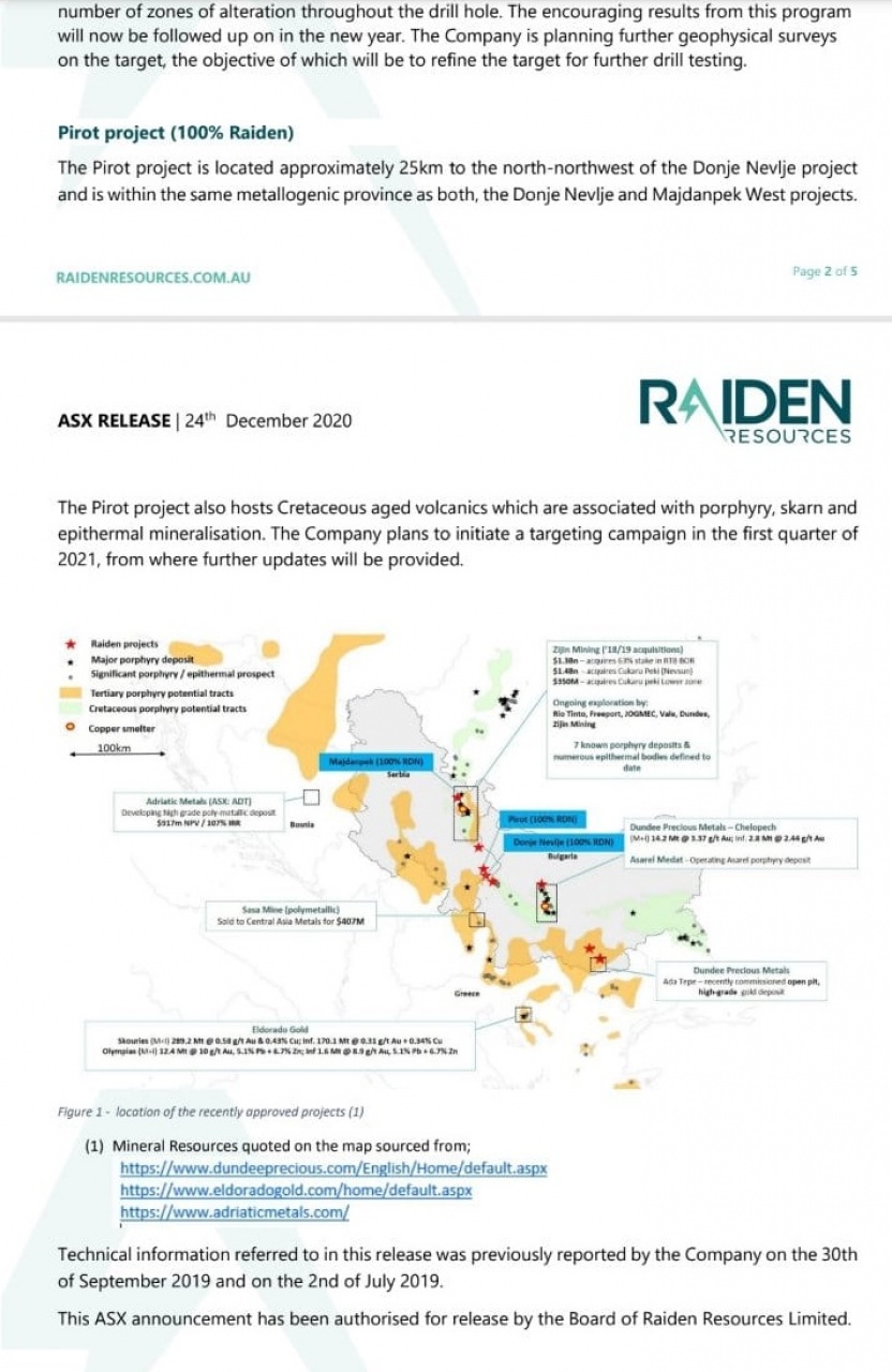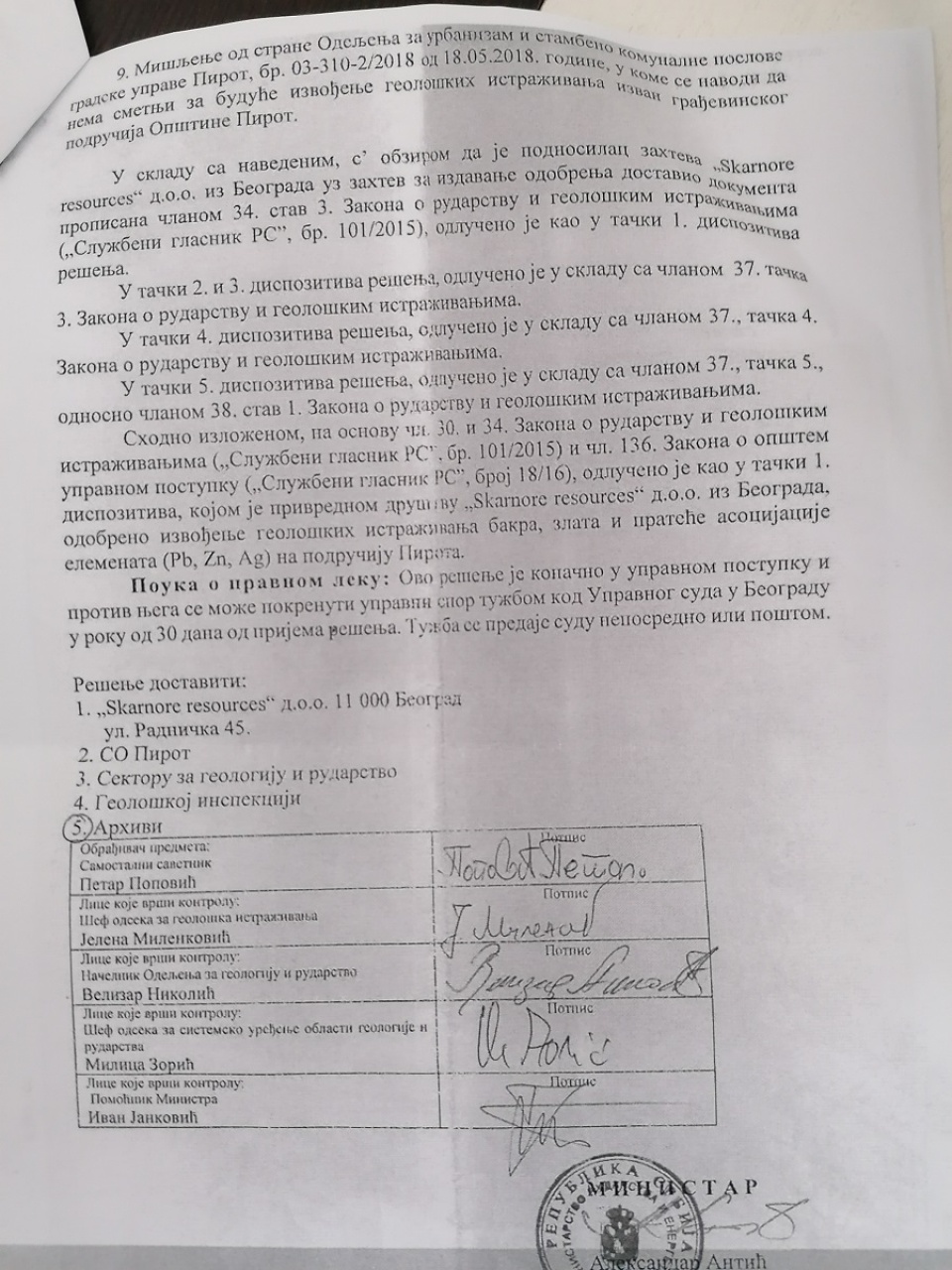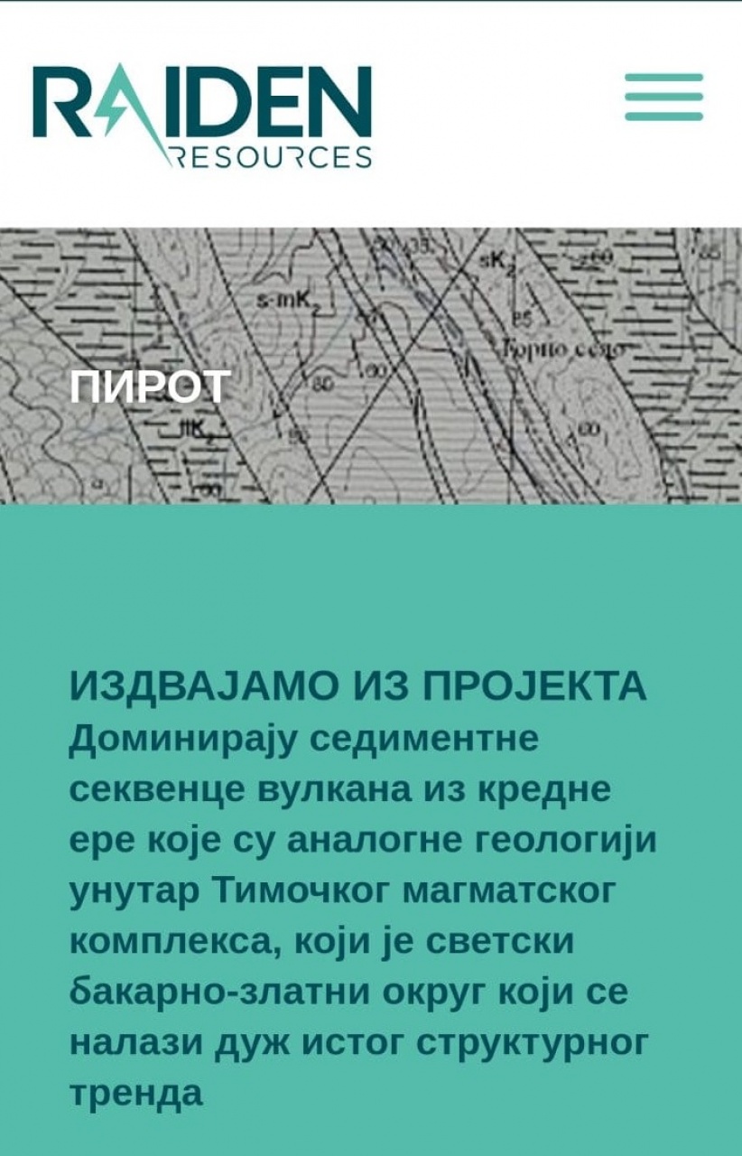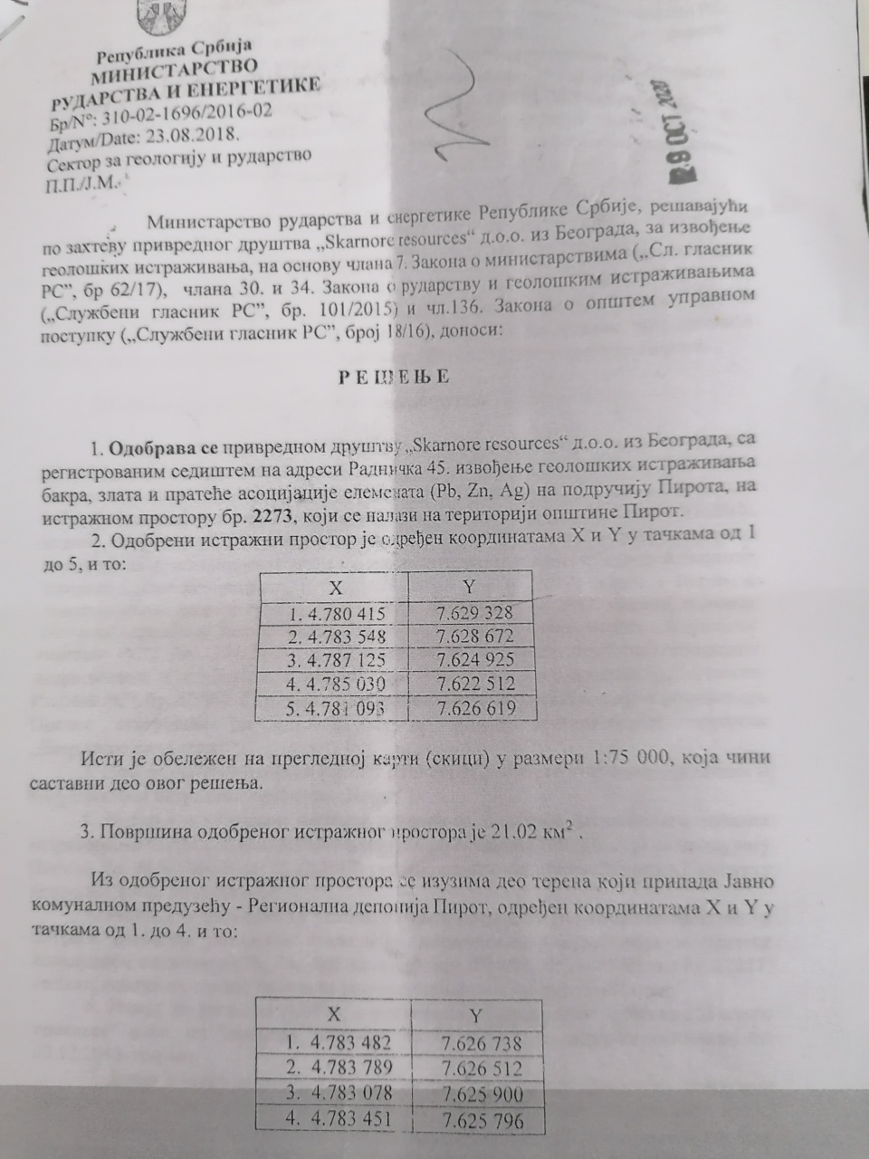 Prema dokumentaciji koju posedujemo, Ministarstvo rudarstva i energetike je Privrednom društvu "Scarnore resources" iz Beograda dalo odobrenje za izvođenje geoloških istraživanja bakra i zlata na teritoriji Pirota. Ovo privredno drušvo je u vlasništvu rudarske kompanije iz Australije "Rayden Resources". Na zvaničnom sajtu ove kompanije jasno se može videti da intenzivno rade na ovom projektu. Površina prostora koji se istražuje, a na kome će se i potencijalno graditi rudnik, je oko 21 kilometar kvadratni. Površina koja se istražuje počinje u neposrednoj blizini Pirota, pored brda Sarlah, na kilometar od grada. Zahvata i atare sela Gnjilan, Mali i Veliki Suvodol i proteže se prema selu Staničenje, a zatim dolinom Nišave nazad ka industrijskoj zoni. Ukoliko se nastavi sa ovim procesom istraživanja i izgradnje rudnika Pirot će biti pretvoren u rudarsku koloniju i doživeti ekološku subinu Bora i Majdampeka. Poznati su mnogobrojni štetni efekti na životnu sredinu ovakvih rudnika. Posebo zabrinjava činjenica da o ovome već tri godine ćute i neinformišu javnost Gradska uprava Pirot, lokalni i republički funkcioneri kao i gradonačelnik Vasić. Imamo neposredne dokaze da su gradonačelnik i Gradska uprava, obavešteni o ovim istraživanjima i planovima, kaže dr Todorović.