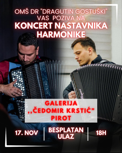 17. nov 2025. 10:00 Muzička škola "Dr Dragutin Gostuški" Pirot organizuje koncert koji će biti održan u ponedeljak, 17. novembra sa početkom u 18 sati u Galeriji ,,Čedomir Krstić" Pirot.Na koncertu ... -