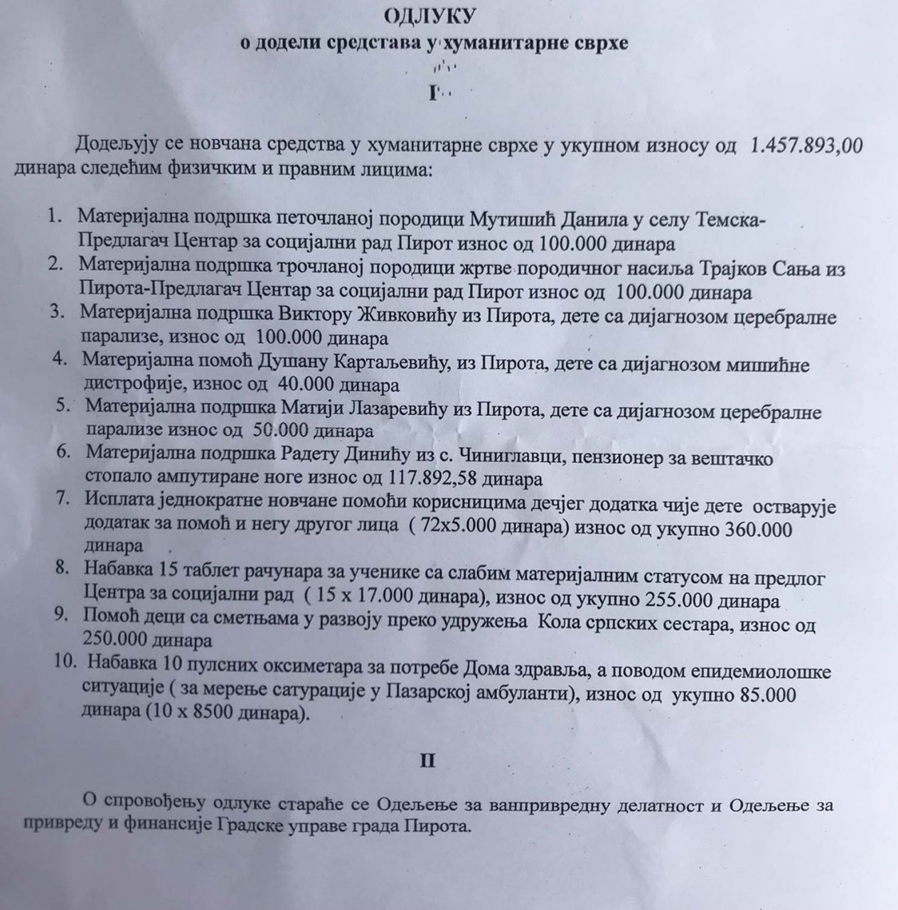 Odlučeno je da se iznos od 1.457.893 dinara dodeli najugrženijim fizičkim i pravnim licima. Nakon predloga koje su Gradskoj upravi uputili gradjani i mnoge institucije, formirana je komisija iz redova Centra za socijlani rad, Dečije zaštite, nevladinih organizacija i doneta je konačna odluka.
