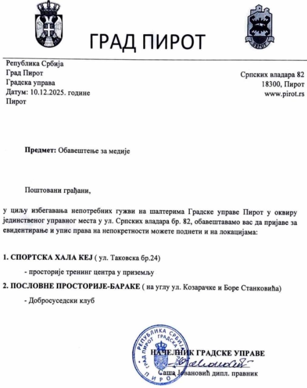 U cilju izbegavanja nepotrebnih gužvi na šalterima Gradske uprave Pirot, u okviru JUM u ulici Srpskih vladara, obaveštavamo građane da prijave za evidentiranje i upis prava na nepokretnosti mogu da podnesu i u Sportskoj hali "Kej" i u Dobrosusedskom klubu, u Kozaračkoj ulici.