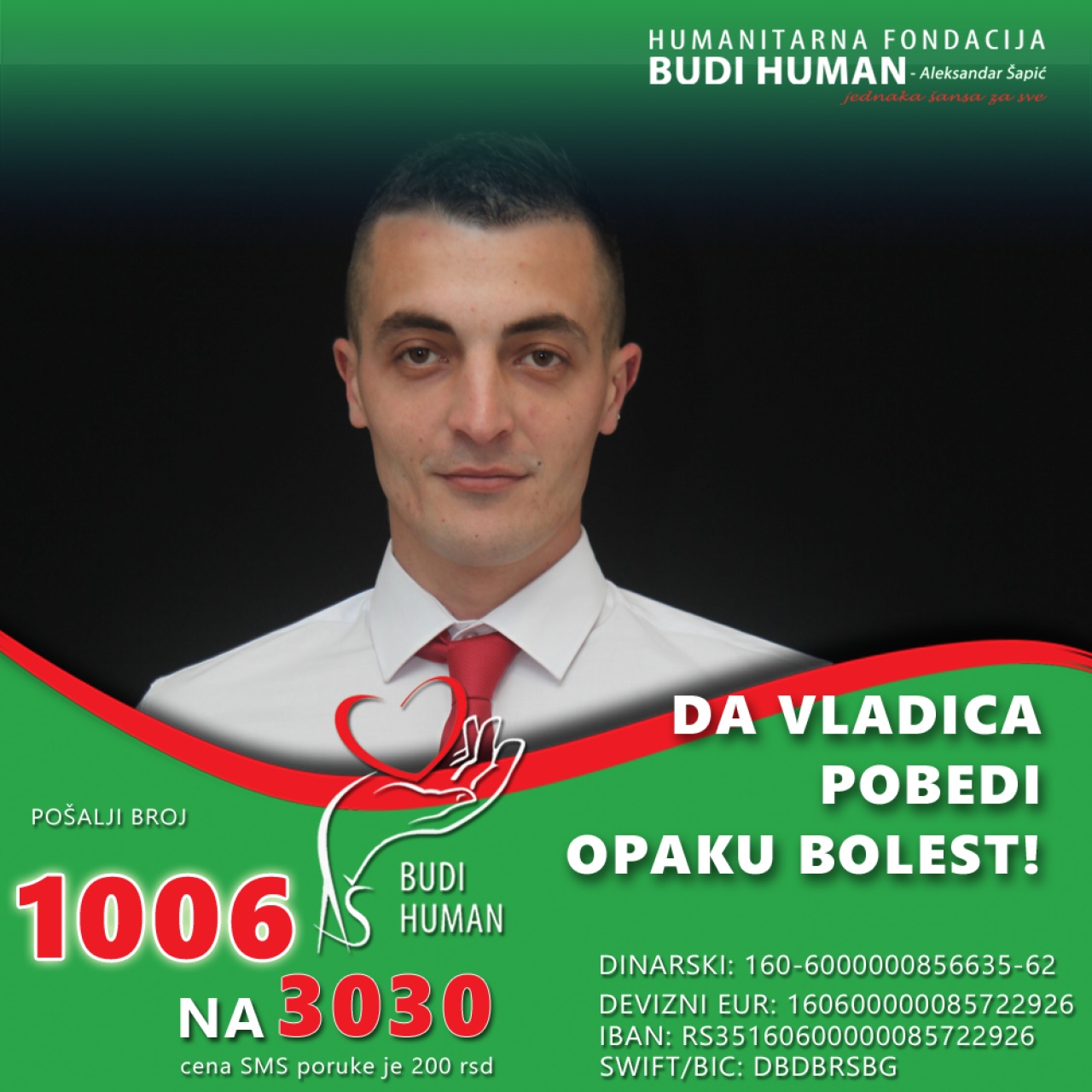 Vladica Veselinović iz Pirota (31) boluje od teške bolesti. Porodica je preko Humanitarne fondacije "BUDI HUMAN - Aleksandar Šapić" pokrenula akciju prikupljanja sredstava, s obzirom da su potrebna značajna sredstva radi nastavka lečenja.