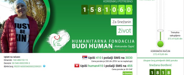 Očekujući da će biti još humanih, da Snežani, njenoj dečici i suprugu vratimo osmeh, ponavljamo “broj 410” pod kojim je Snežana u Fondaciji Aleksandra Šapića,”Budi human”!
