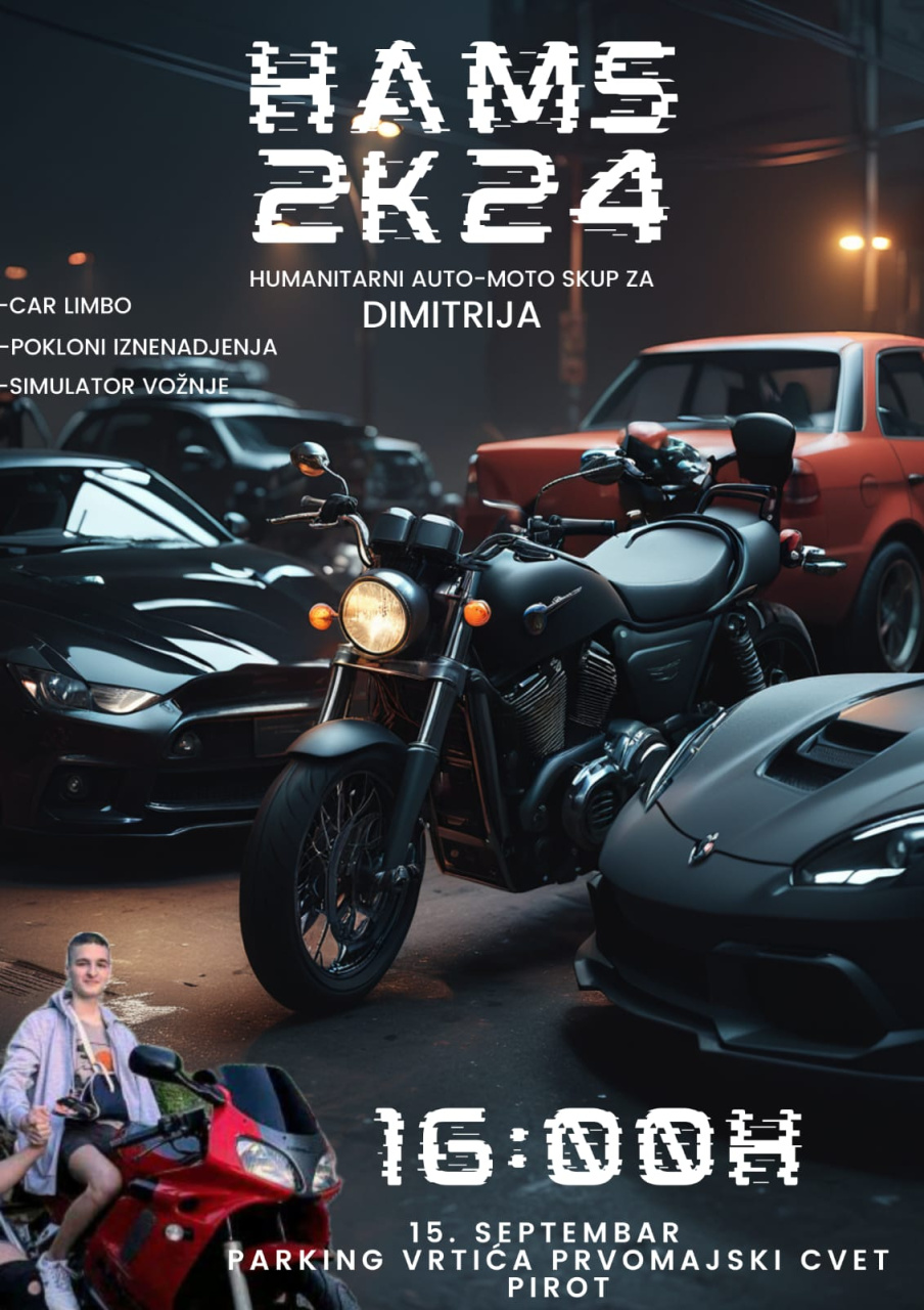 "Dragi prijatelji, obaveštavamo Vas da će se treći Humarnitarni auto-moto skup "HAMS 2K24" održati 15. septembra u Pirotu, na već dobro poznatoj lokaciji - parking vrtića Prvomajski Cvet! Pomoć će nekome uvek biti potrebna, a ovoga puta će biti usmerena našem sugrađaninu Dimitriju Pešiću, kome je pre nekoliko meseci amputirana leva noga, zbog saobraćajne nezgode. Pomozimo njemu i njegovoj porodici da sakupi 50.000 evra i pokažimo humanost na delu još jednom!
