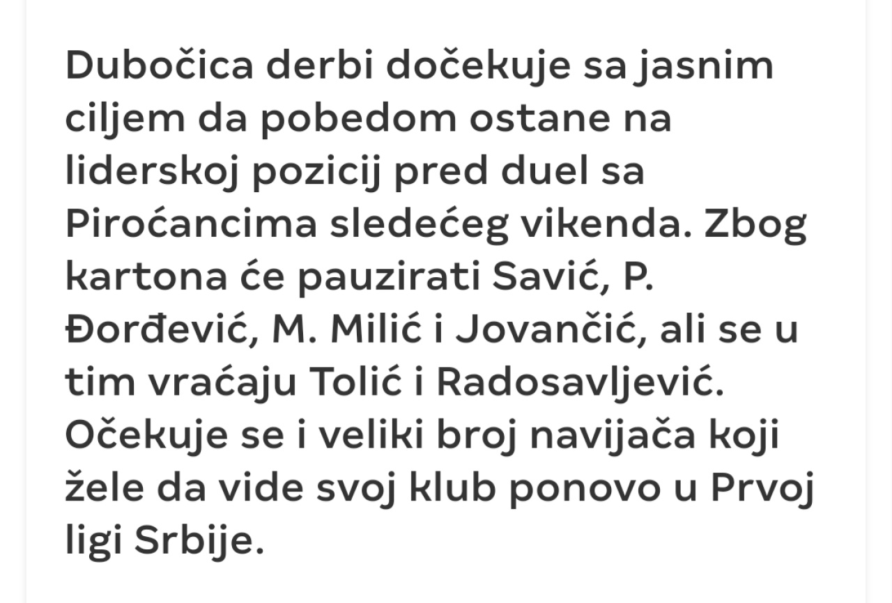 Cetiri најстандарднија играча Дубочице паузирају, Савић, Ђорђевић, Милић и Јованчић и гле чуда, не играју против осокољеног Борца..Da li će i tako да буде као и са Мешевом.