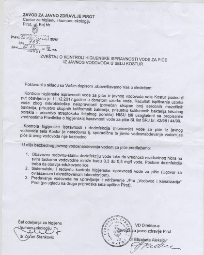Ovih dana od meštana sela Kostur dobili smo informaciju da voda nije za piće u ovom selu već duže vremena. Dobili smo i zvanične nalaze Zavoda za Javno zdravlje koji su posle pregleda, takodje potvrdili da voda nije za piće. Predsednik Mesne zajednice, kažu gradjani, nije adekvatno reagovao!